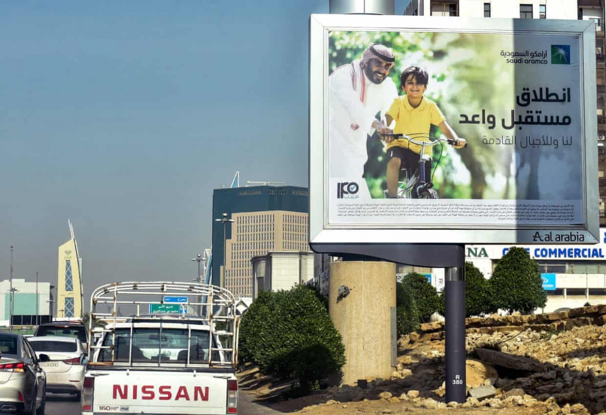 آگهی عرضهی اولیهی عمومی سهام آرامکو در سال 2019 در ریاض که در تاریخ این کشور بیسابقه بود. عکس: فایض نورالدین/آژانس فرانس پرس/گتی ایمجز