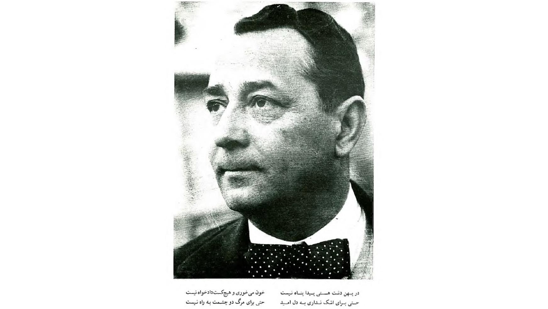 «جوانی بر من خوش نگذشته است و امید ندارم که روزگارِ تو بهتر باشد. دورانِ ما عصرِ «ننگ و فساد» است و هنوز نشانه‌ای پیدا نیست از اینکه آینده جز این باشد. آخر سال نکو را از بهارش ‌می‌توان شناخت. سرگذشت من خون دل خوردن و دندان به جگر افشردن بود و ‌می‌ترسم که سرنوشت تو نیز همین باشد. شاید بر من عیب بگیری که چرا دل از وطن برنداشته و ترا به دیاری دیگر نبرده‌ام تا در آنجا با خاطری آسوده‌تر به سر ببری. شاید مرا به بی همتی متصف کنی. راستی آن است که این عزیمت بارها از خاطرم گذشته است. اما من و تو از آن نهال‌ها نیستیم که آسان بتوانیم ریشه از خاک خود برکَنیم و در آبوهوایی دیگر نمو کنیم.»