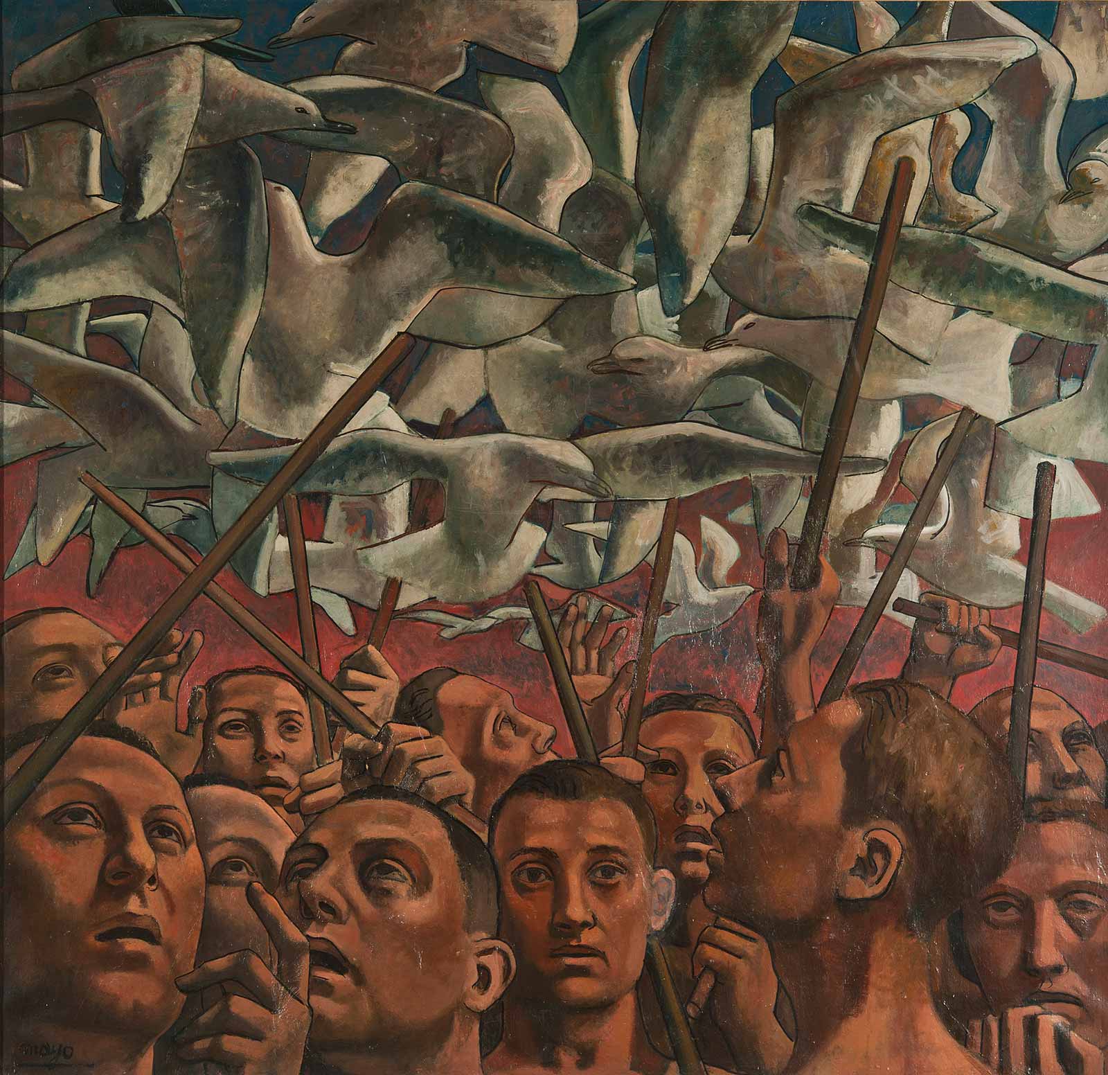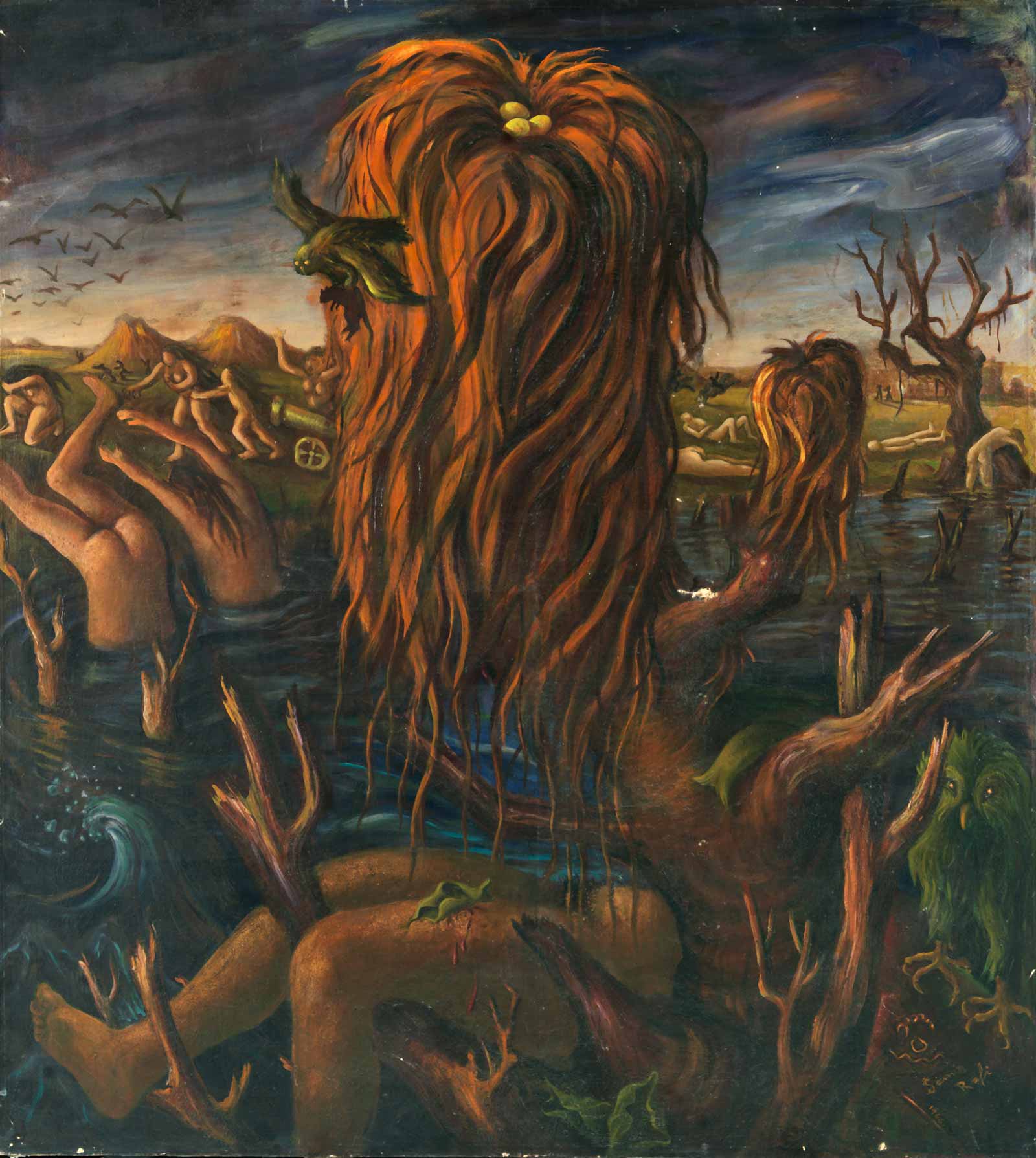 مصر در اواخر دههی 1930 کشوری بود که پیشاپیش و عمیقاً دوپاره شده بود، در عین حال که جاذبهی فاشیسم رو به رشد بود و بریتانیا هم هرگونه امکان استقلال ملی را سلب میکرد. جنگ جهانی دوم که از راه رسید، اقتصاد از کار افتاد و فقر به سرعت افزایش یافت، چون هزاران سرباز از سرتاسر کشورهای مشترکالمنافع به سمت مصر سرازیر شده بودند. این زمانهی آشفته در تصاویری چون چشمی خونین در میان شاخههای درهمپیچیده در نقاشی «زایش»، اثر لورن مارسل سالیناس (۱۹۴۴) راه بیان خود را مییافت؛ یا در تابلوی درخت مودار در «برهنگان»، اثر سمیر رفیع (۱۹۴۵)، برهنگانی ایستاده در مقابل زنان و مردان بیچهره که یا مردهاند و یا از خطری نامعلوم میگریزند؛ یا در تصویر یک دختر برهنه، که هم در دریایی از شعلههای آتش و هم در چنگ غولی وحشتناک گرفتار شده است، در تابلوی «غول و دختر» اثر اینجی افلاطون (۱۹۴۱).
