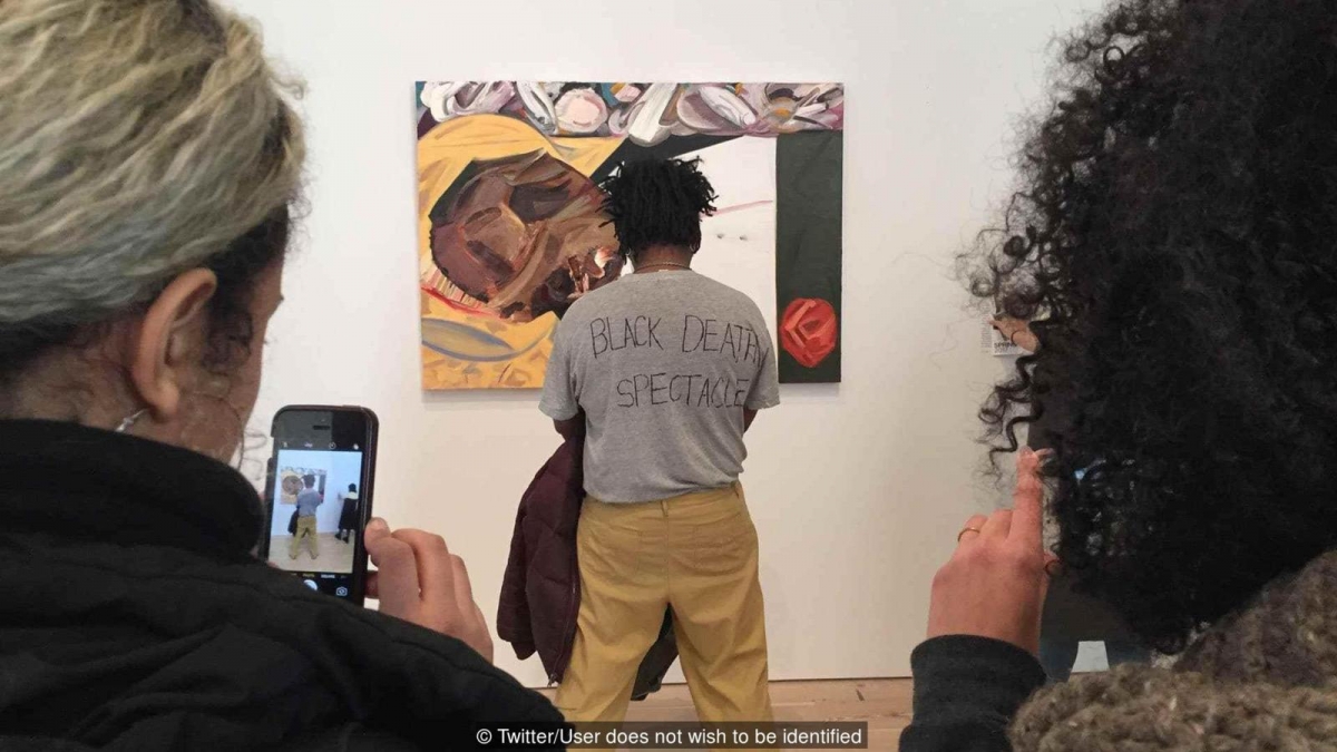 پارکر برایت، هنرمند تجسمی، به برداشت هنریِ دینا شولتز از قربانی آمریکایی که لینچ شده بود (اِمِت تیل)، با بستن راه دید آن اعتراض کرد.