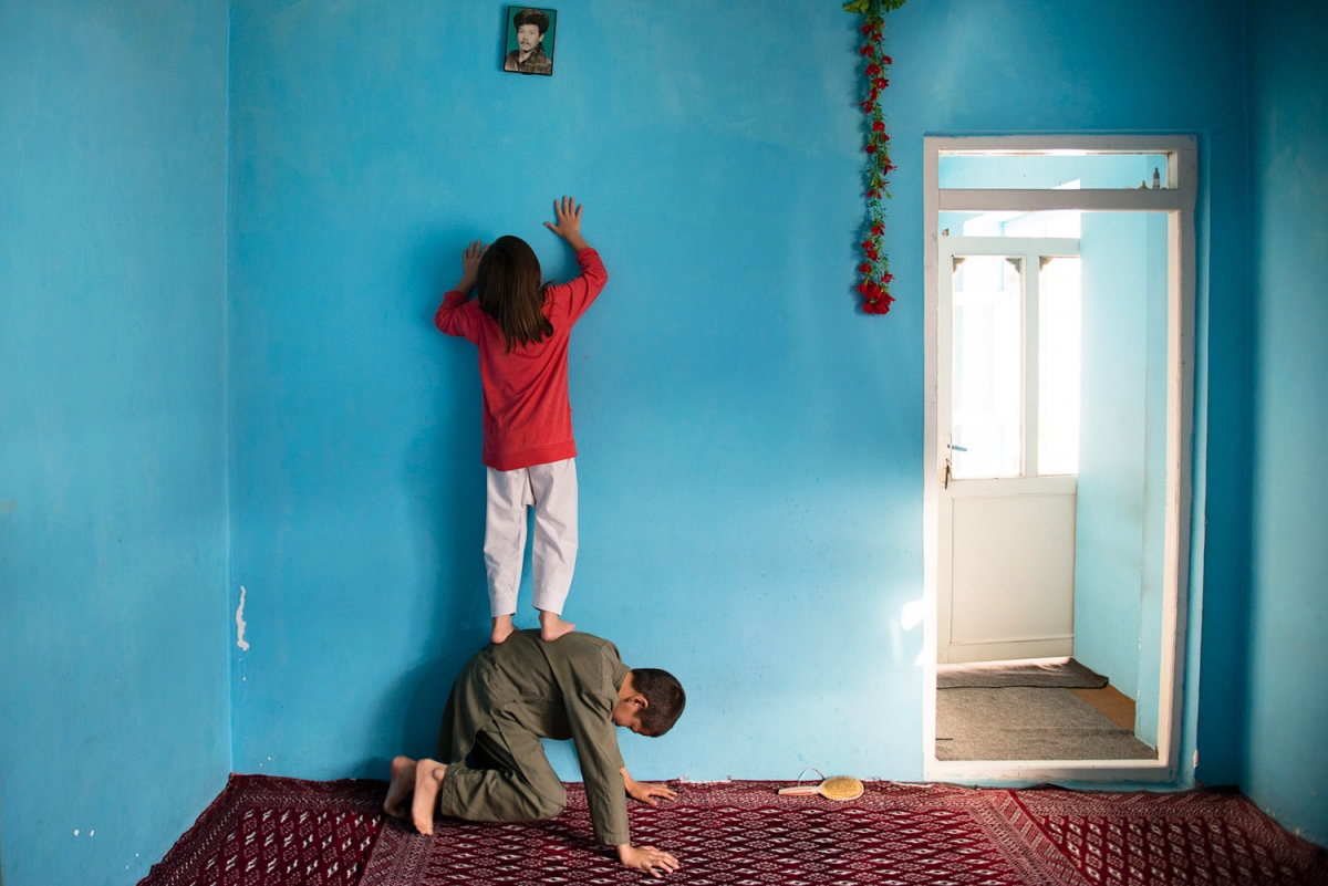 مینا، 38 ساله، در هنگام زایمان از کمر به پایین فلج شد. از آنجایی که حالا مینا بیکار است، دختر بزرگش (سمت چپ) را از مدرسه بیرون آورده تا در خانه به او در نگهداری از خواهر و برادرهایش کمک کند.