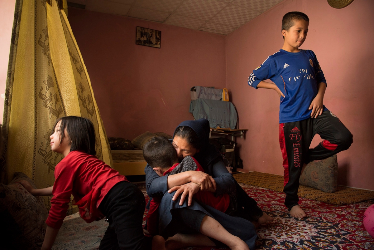 ملکه، 28 ساله، در حال آرام کردن بچهاش بعد از دعوا با خواهر و برادرهایش است. ملکه و پنج فرزندش در یک اتاق کوچک در محلهی وزیرآباد کابل زندگی میکنند.