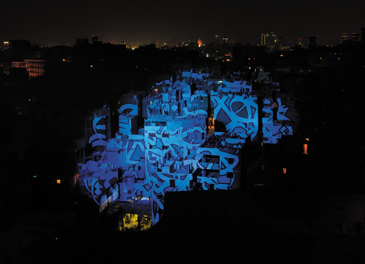 گوشههای نامتوازن و اجزای نامتقارنِ این اثرِ دیواری، با رنگهای آبی، نارنجی، و سفید رنگآمیزی شده است. دو بخش از دیوار کوتاهِ بامِ مسطحی که چند طبقه از زمین فاصله دارد و بر روی آن یک گله گوسفند به آرامی در هم میلولند، با دوغاب سفید شده و مثلثهای نارنجیِ ناهمگون که حاشیههایشان سیاه شده است سراسر آن را پوشاندهاند. این اَشکال انتزاعی و بدون نظم و ترتیب به نظر میرسند. اما اگر از کافهی روی تپهی مقتم که در نزدیکی این محله واقع شده است به آنها نگاه کنیم، تمام این لکههای رنگی ناهمگون به ناگهان در کنار هم قرار میگیرند و یک عبارتِ عربی را میسازند که به خطِ خوش نوشته شده است و به این ترتیب، تعدادی ساختمان زشت را به شکل شعری در آورده است که تاریخ و فرهنگِ آن محله را گرامی میدارد.