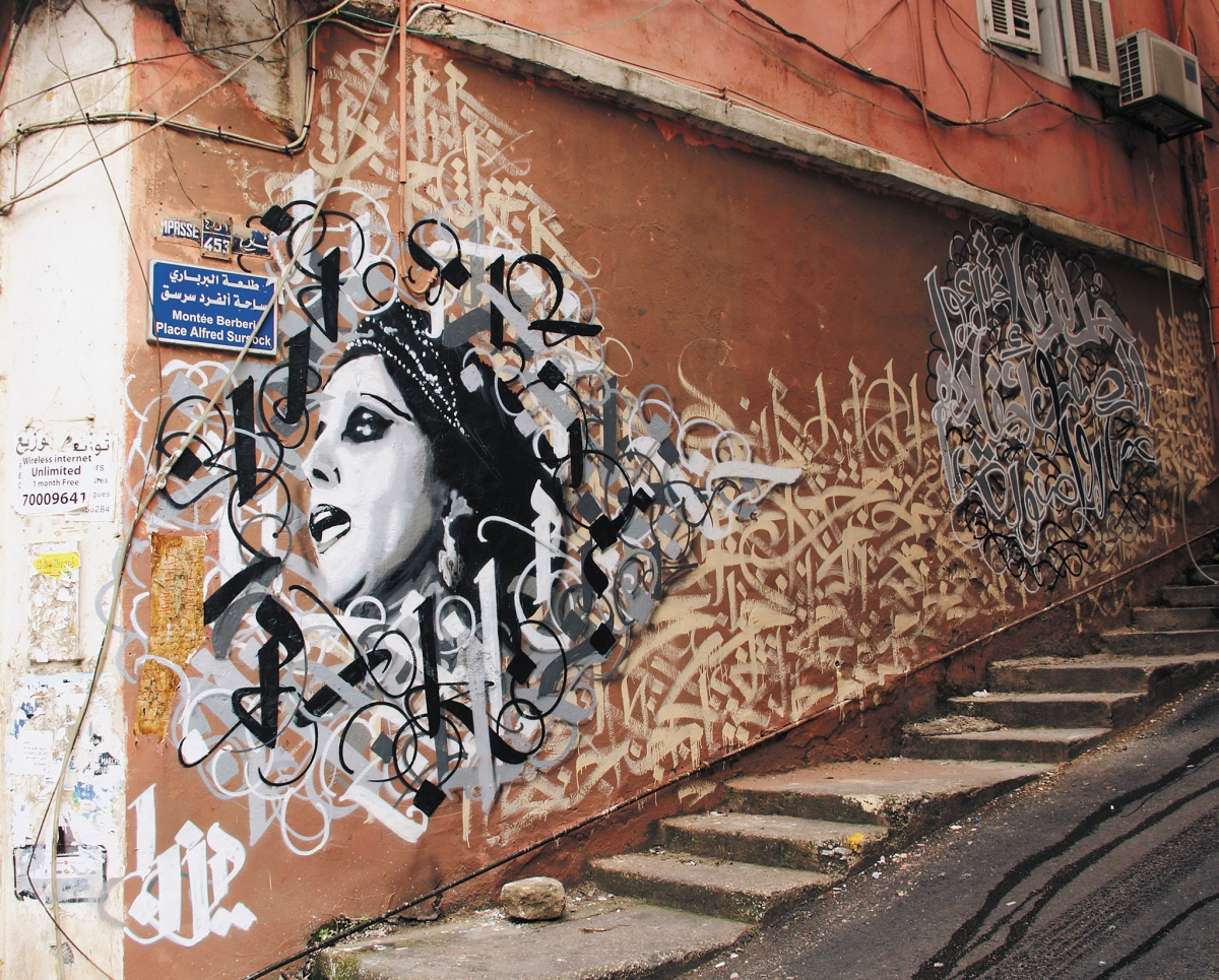 در شهر کفرنبیل سوریه، مردم خوشنویسی را به بخشی از مبارزاتشان علیه جهادگرانِ جبههی فتح شام تبدیل کردهاند، و از توئیتر نیز برای انتشار تصاویر پیامهایی که نوشتهاند استفاده میکنند. جهادگران پی در پی این پیامها را پاک میکنند و هنرمندان پیامهای جدیدی خلق میکنند. تمام نقاشیهای دیواری البته از سر مخالفت با حکومتها خلق نمیشوند. در لبنان، یزن حلوانی از خوشنویسی برای خلق پرترهی چهرههای فرهنگی کشورش استفاده میکند، با این امید که این نقاشیهای دیواری به یکپارچه شدن کشوری که در اثر جنگ داخلی چندپاره شده است کمک کند. او برای این که آثارش را برای همگان قابل فهم کند، از نوشتن جملات پرهیز میکند و به جایش تنها از حروف استفاده میکند و آنها را به صورت چندلایه و روی هم مینویسد. عابران اغلب حین کار کردن او، به تماشایش میایستند و او نیز دیگر در این کار خبره شده است که چطور با پلیسها و مأموران امنیتی همکلام شود و آنها را متقاعد کند که قصد آسیب رساندن به دیوارهای شهر را ندارد بلکه، برعکس، میخواهد به زیباسازی شهر کمک کند. یک بار، پلیسی که از کنار او میگذشت آنقدر سر ذوق آمد که اسلحهی ام۱۶ اش را کنار گذاشت و یکی از اسپریهای رنگ را برداشت تا به او کمک کند.