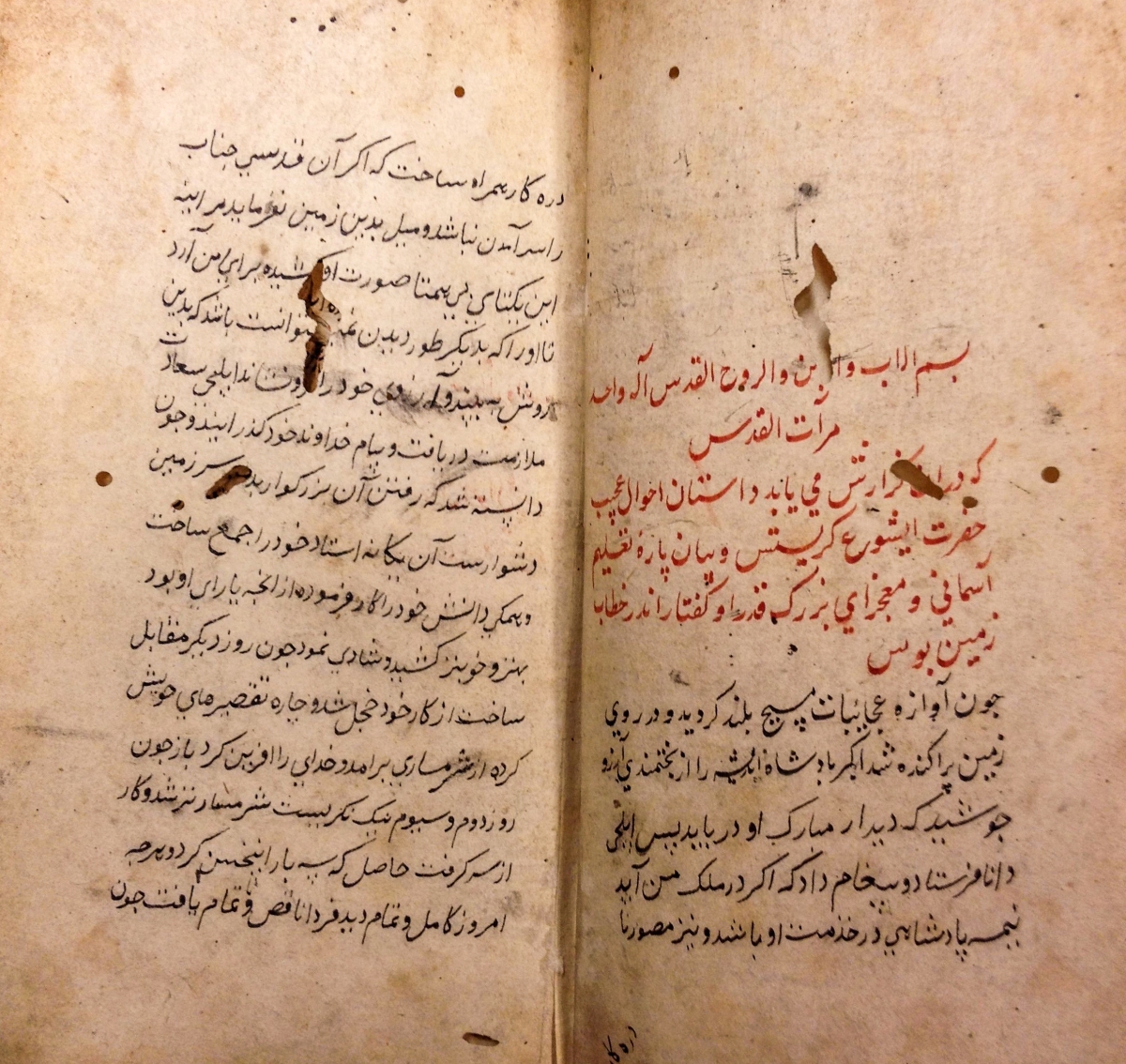 مرآتالقدس اثر زیرونیمو شویر، استنساخ در 8 رمضان 1027. ترجمهی شویر به درخواست شاه اکبر صورت گرفت و کار آن در سال 1602 در آگره، با همکاری مولوی عبدالستار ابن قاسم لاهوری، پایان گرفت. کتابخانهی بریتانیا