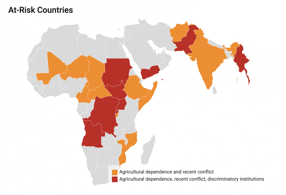 نقشه‌ی زیر کشورهایی را نشان میدهد که به نظر ما بیشتر در معرض خطرات ناشی از بیثباتی آب و هوایی هستند. شمار چشمگیری از کشورها – ۲۰ کشور در کل – با ترکیبی از دو خطر اول، وابستگی به کشاورزی و درگیری‌های اخیر، مواجه‌اند. این کشورها با رنگ نارنجی مشخص شدهاند. ۹ کشور دیگر (آنگولا، جمهوری دموکراتیک کنگو، میانمار، پاکستان، روآندا، سودان جنوبی، سودان، اوگاندا، و یمن) علاوه بر دو عامل اول، از محرومیت سیاسی قومیِ زیادی رنج می‌برند. این کشورها در نقشه با رنگ قرمز مشخص شده‌اند.