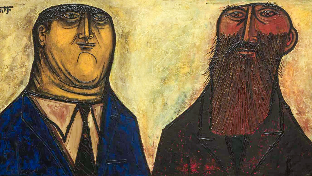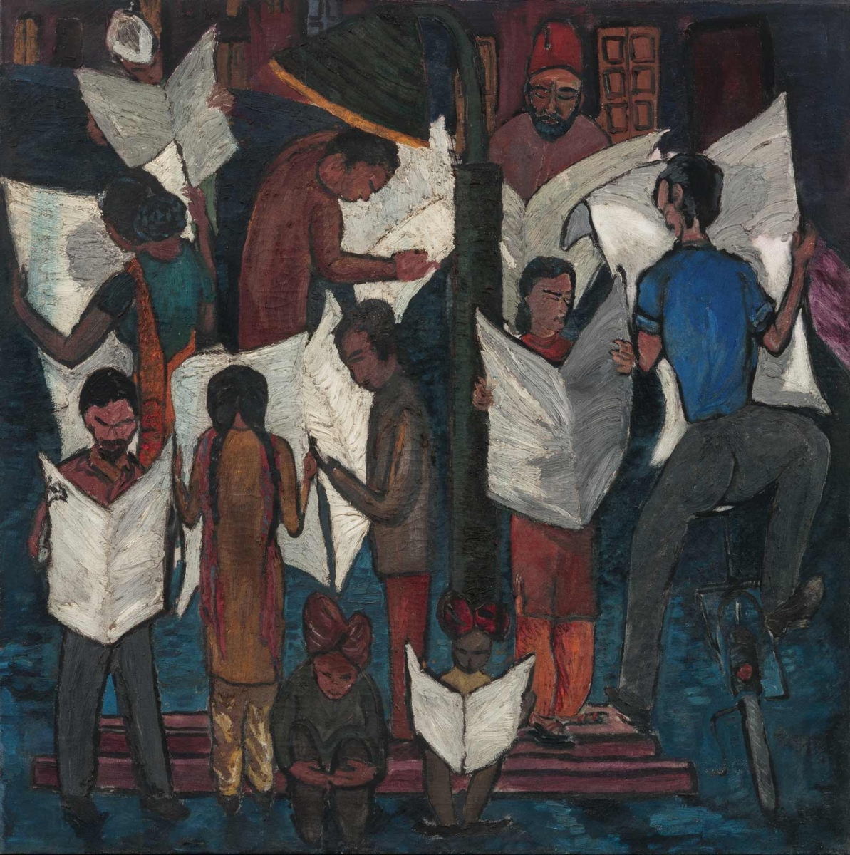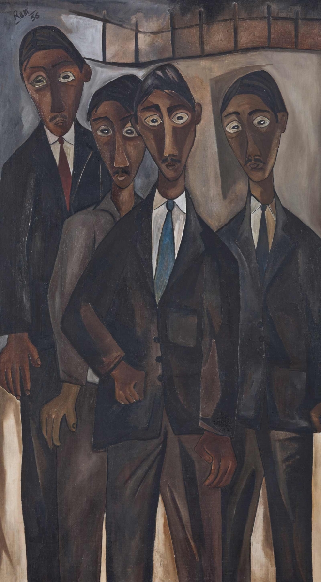 اما در هیچ یک از نقاشیهای این قسمت نمیتوان نشانهای از این مسائل دید. با کمی حسن نیت میتوان دو اثر را نمونههایی از کاوش واقعیت اجتماعی شمرد: فارغ التحصیلان بیکار (۱۹۵۶) اثر رام کومار (که تصویری از تنگدستیِ طبقهی متوسط است که به شکلی طعنهآمیز و شاید تا حدی با دلسوزی به حال خود، ترسیم شده است) و ثروتمند و دورهگرد (۱۹۵۵) اثر سوزا. اما بقیهی این نقاشیها که به ظاهر با آگاهی اجتماعی همراهاند، به درجات مختلف آرام، خوشخلق، خوشبین و خوشحال هستند. به نظر میآید که گویا این آثار با هدف حفظ امید هنرمند خلق شدهاند.