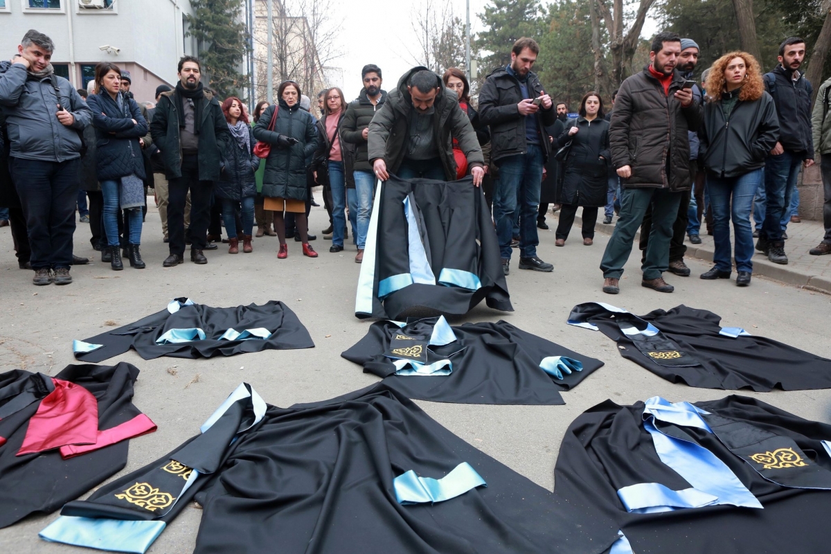 فوریهی ۲۰۱۷: دانشگاهیان دانشگاه آنکارا لباسهای خود را به نشانهی اعتراض به اخراج دستهجمعیِ استادان درآوردهاند. آدم آلتان/اِیافپی/گتی ایمجز