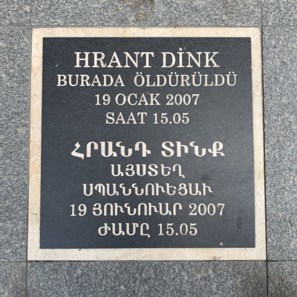 کمی دورتر از ردیف مغازههای پر زرقوبرق، کافهها و رستورانهای شلوغ محلهی «نیشانتاشی» در شهر استانبول، در خیابان اصلیای که بسیار نزدیک به آن ردیف مغازهها و هیاهو است اما هیچ نشانی از زرقوبرق ندارد، میان یک مغازهی عینکفروشی و مغازهای که کیف و چمدان ارزان میفروشد، پلاک سیاهی، با حاشیهی طلایی رنگ بر سنگفرش خیابان نقش بسته است: «هرانت دینک در ۱۹ ژانویهی ۲۰۰۷، ساعت ۱۵:۰۵ در اینجا کشته شد.»