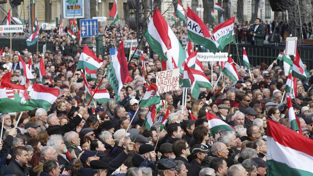 تجمع مردم برای شنیدن سخنرانی ویکتور اوربان، نخست وزیر پوپولیست مجارستان، در بوداپست. عقیده بر این است که پیشرفت نامتوازن از کمونیسم به سرمایه‌داری زمینه را برای تقویت پوپولیسم در اروپای مرکزی فراهم کرده است. عکس: لازلو بالوق/گتی ایمجز