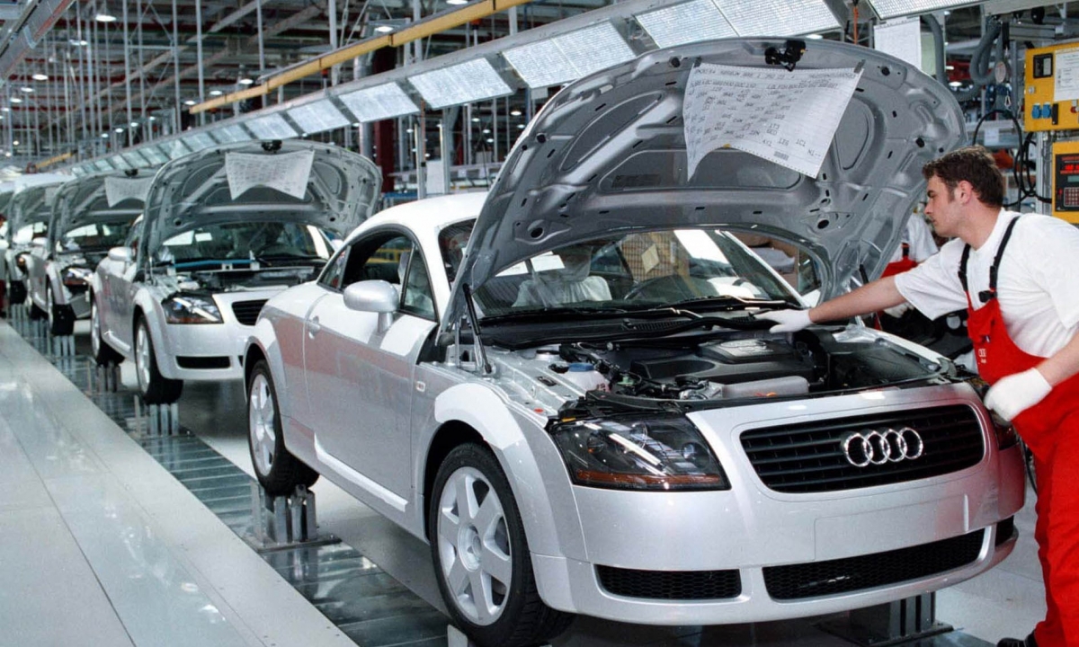 همه‌ی آئودی‌ تی‌تی‌های دنیا در این کارخانه مونتاژ می‌شوند. علاوه بر این، موتور بسیاری از دیگر مدل‌ها نیز در این کارخانه تولید و برای مونتاژ به آلمان و دیگر جاها فرستاده می‌شود. در یک تالار عظیم، روبات‌های ژاپنی زردرنگ غول‌پیکر با سر و صدا سرگرم مونتاژ قطعات، برش، جوشکاری، چسباندن و سرِهم‌کردن خودروها با کمترین میزان مداخله‌ی انسان هستند. کارگران بین تالارها می‌دوند، بسیاری از آن‌ها اونیفرم‌های رنگارنگی بر تن دارند که نشانگر جایگاه آن‌ها در خط مونتاژ است.