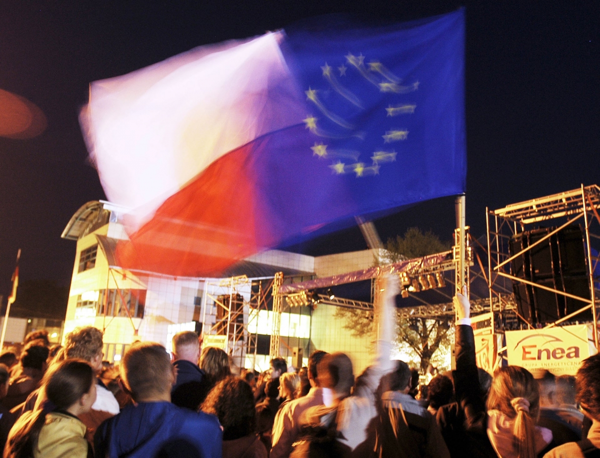جشن و پایکوبی لهستانی‌ها به مناسبت پیوستن به اتحادیه‌ی اروپا در آوریل ۲۰۰۴. عکس: کارستن کول/گتی ایمجز