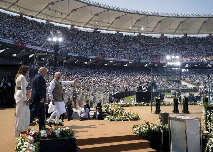 نارندرا مودی به همراه رییسجمهور آمریکا و همسرش، ملانیا، در گردهمایی بزرگی در احمدآباد در 24 فوریه. Eyevine