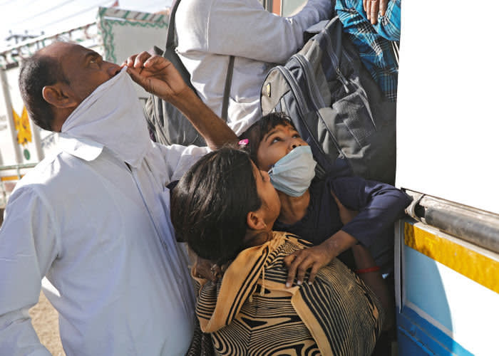 در اطراف دهلی نو در 29 مارس، زنی در مسیر بازگشت به روستای خود، دخترش را به داخل اتوبوسی مملو از جمعیت هل میدهد. Reuters