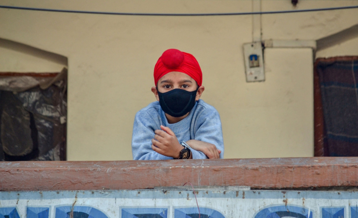 پسری که ماسک بر صورت دارد به بالکن خانهای در شهر سرینگر آمده است، در این شهر نخستین مورد مرگ بیمار مبتلا به کرونا در اواخر مارس به ثبت رسیده است. eyevine
