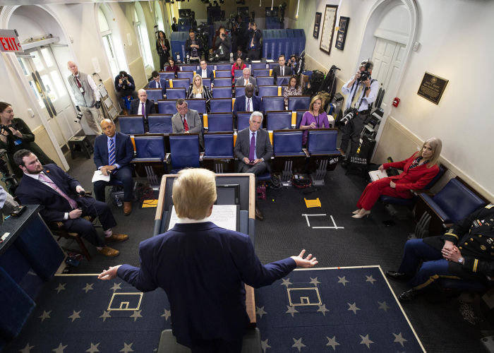 دوتالد ترامپ در نشستی خبری در کاخ سفید، در 1 آوریل، دربارهی ویروس کرونا صحبت میکند در حالی که تعداد موارد مبتلایان در آمریکا به بیش از 200.000 مورد رسیده است. الکس براندون/AP