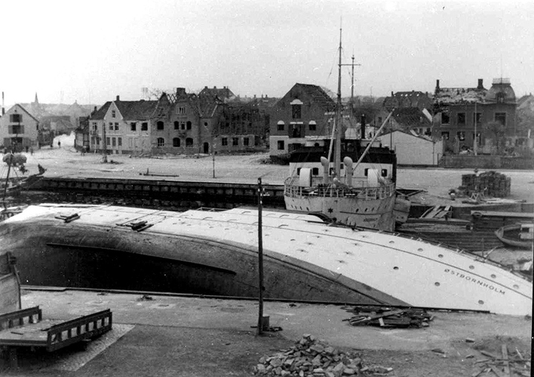 لنگرگاه نکسو در مه ۱۹۴۵، بعد از بمباران هوایی شوروی.