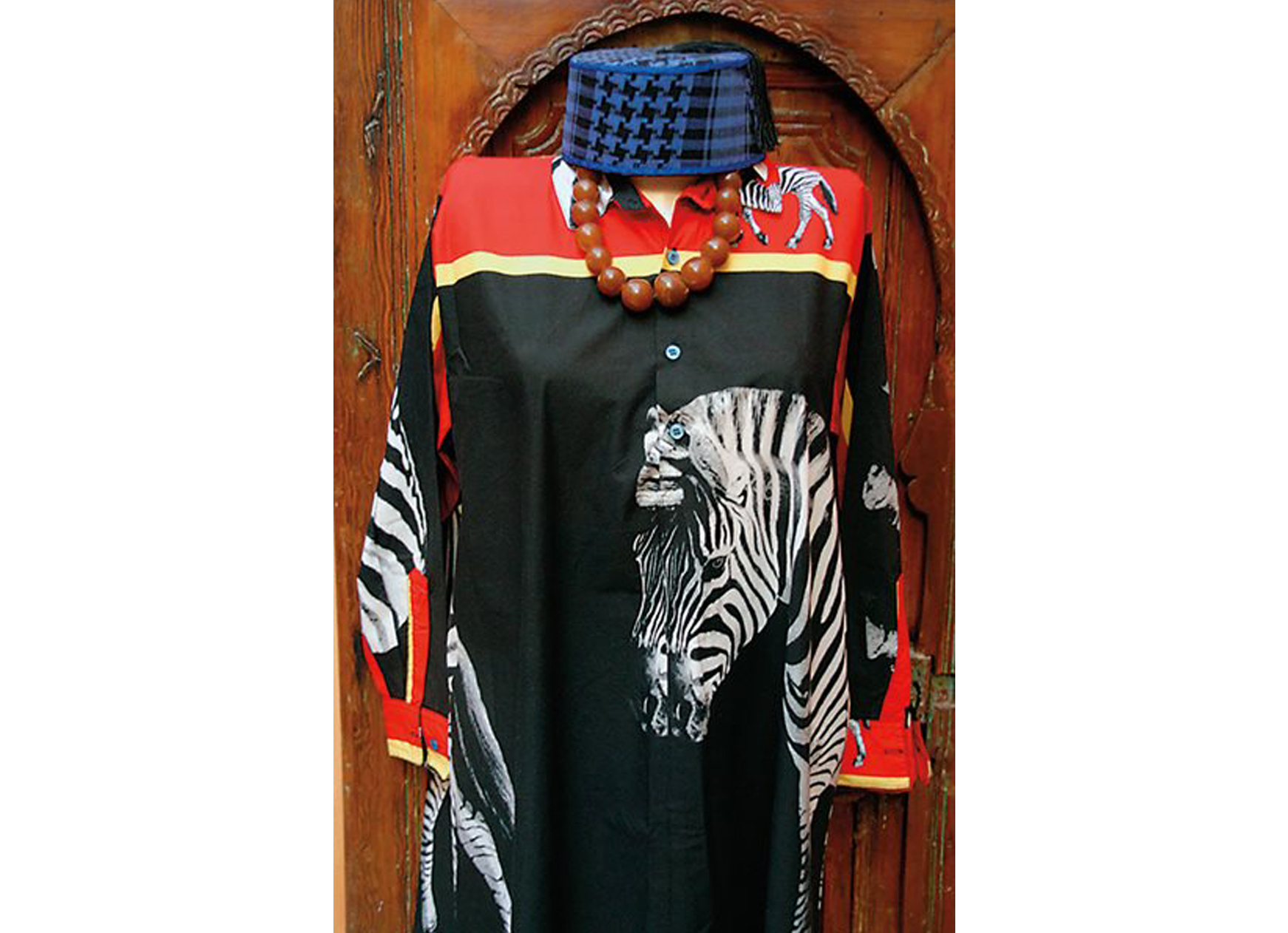 پیراهن با نقش گورخر، مهره‌های کهربا و کلاه فینه، ریاض ییما، مراکش