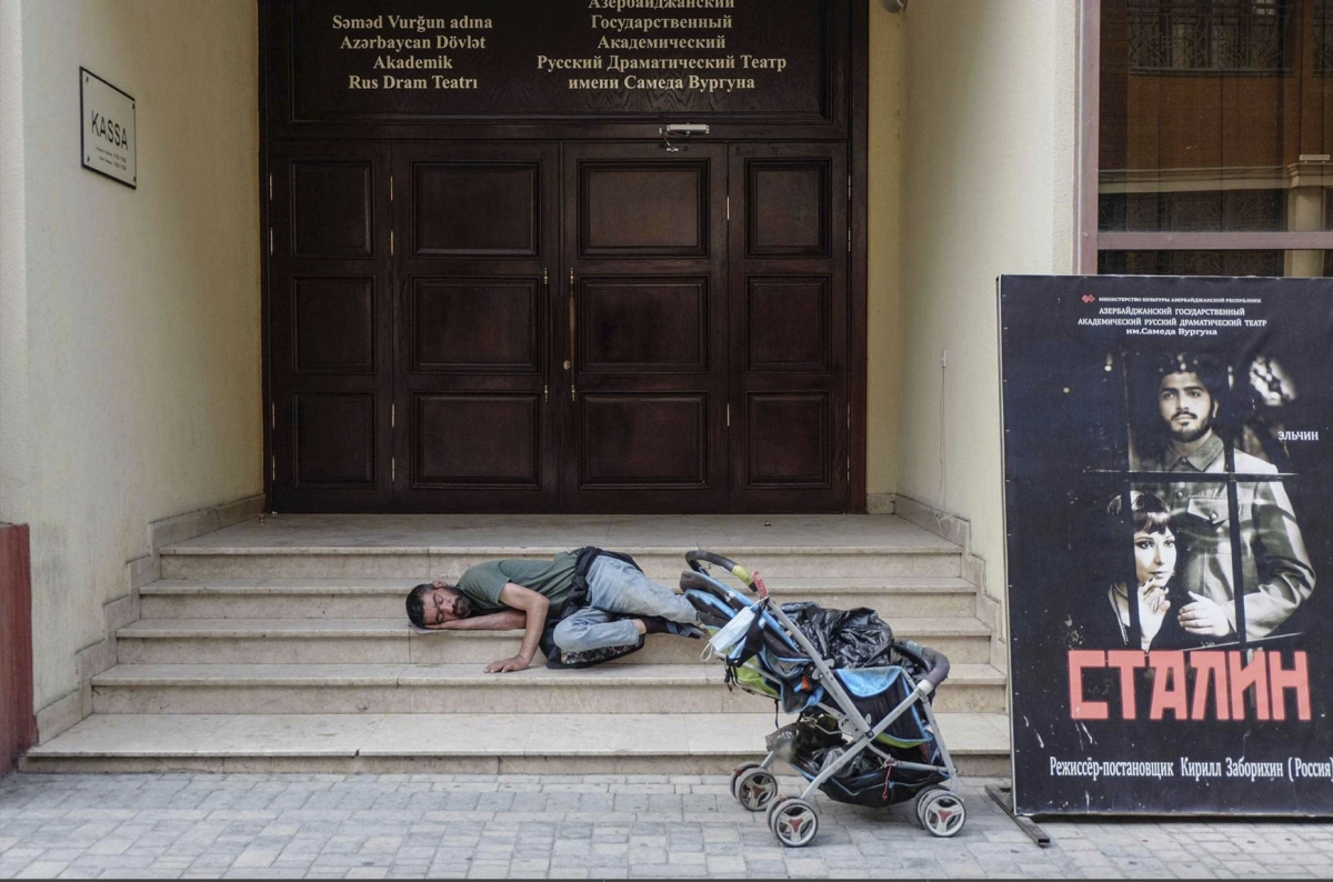 مردی بیخانمان در مقابل تئاتر هنرهای نمایشی روسیه در تورگووایا، ناحیهای در مرکز شهر، در دوران قرنطینهی سفت و سخت در باکو خوابیده است.