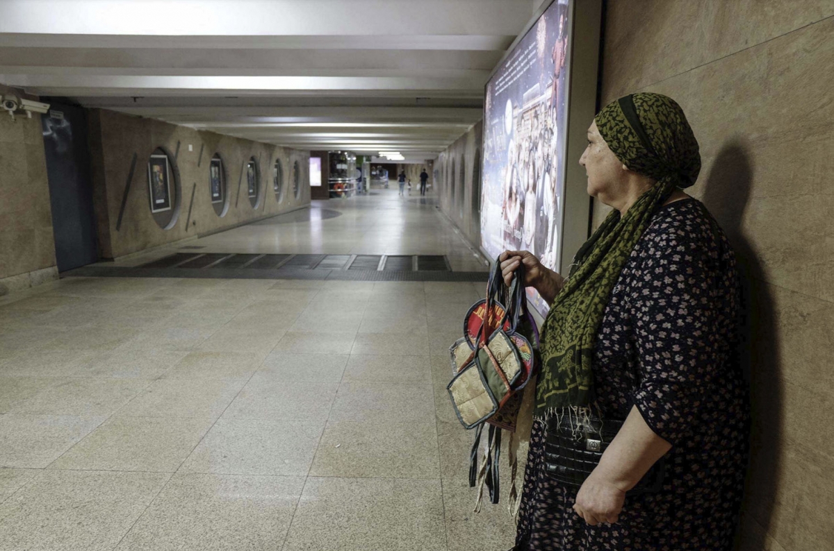 المیرا میرزایوا، 65 ساله، دستساختههای خود را در نزدیکی ایستگاه مترو میفروشد.