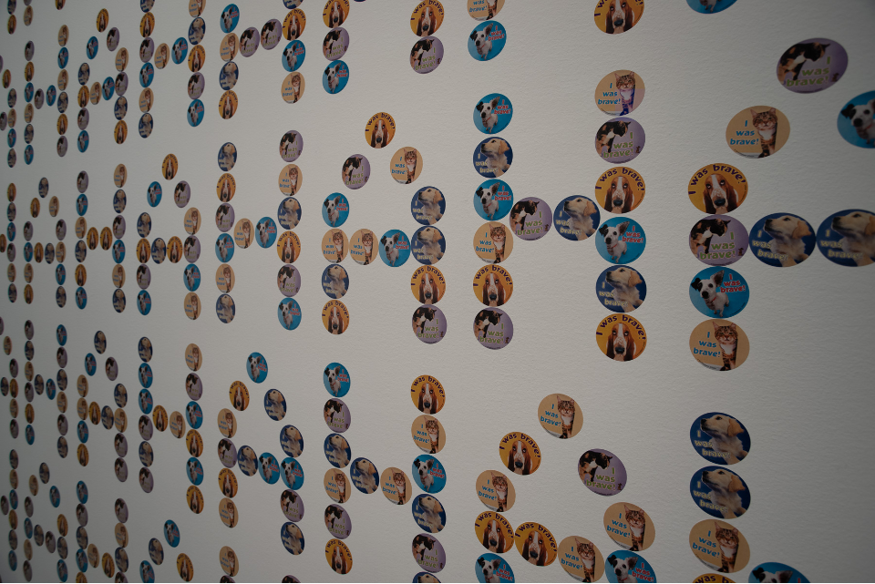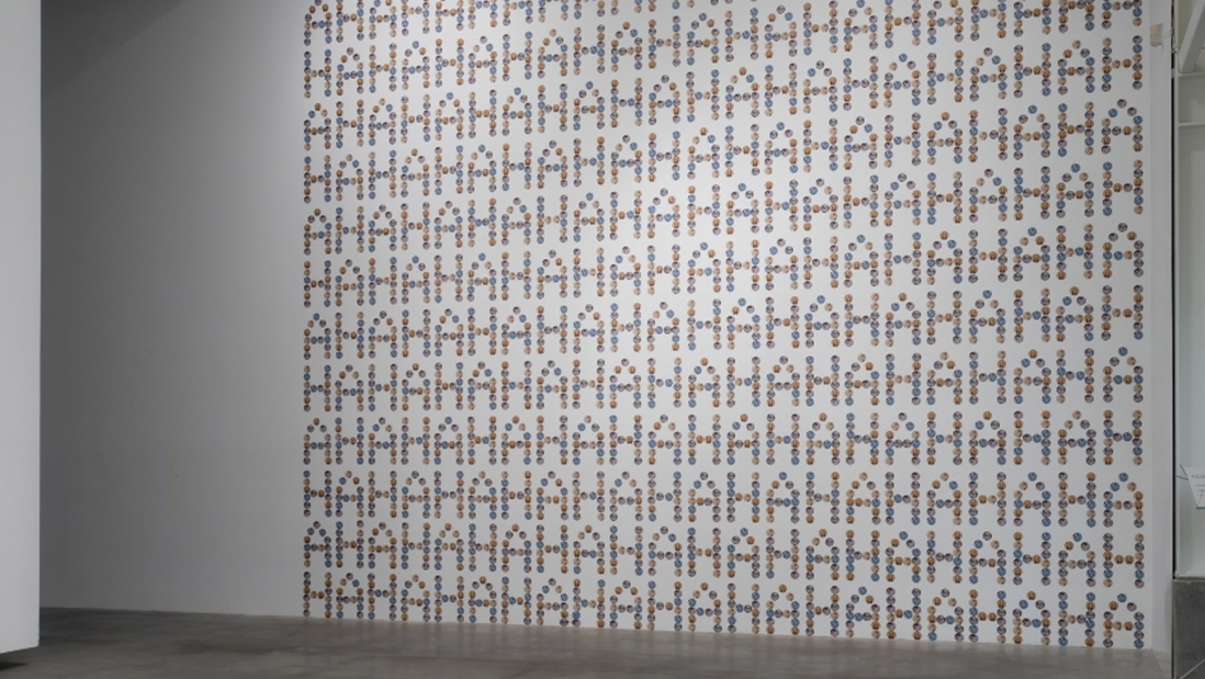 گلنزمن دربارهی انتخاب برچسب به عنوان مادهی خام کارش گفت که علاقهاش به برچسبها دلایل مختلفی دارد، این برچسبها شبیه برچسبهای «هزار آفرین» یا «من رأی میدهم» است که نشاندهندهی نوعی دستاورد، شاگرد یا شهروند خوب بودن و مشارکت در سیستم است؛ علاوه بر این، برچسب عمر کوتاهی دارد و ماندگار نیست، قرار است برای مدتی به لباس، دفتر یا دیوار بچسبد و برای مدتی بخشی از سطح آن را بپوشاند و بعد هم کنده شود، شاید اثر چسبش کمی بر سطح زیرین باقی بماند. خصلت چسبندگی این اثر، گالری را هم به بخشی فعال از سیستم معناسازی تبدیل میکند: بیننده توسط این دیوارِ پوشیده از برچسب احاطه شده است. استفادهی هنرمند از زبان در این اثر در سطوح مختلفی قابل بررسی است. در سطح جزئیات با گزارهای دربارهی شجاعت طرفایم و در سطح کلان زبان تعلیق میشود و کاربردی غیرزبانی پیدا میکند. بیننده به تجربهای پیشازبانی ارجاع داده میشود: به صدای خنده، به اصواتی که میتوانند توسط حروف بازنمایی شوند اما به عرصهی کلام تعلق ندارند. گلنزمن تأکید میکند که «خنده، در این مورد خاص، از سر شوخطبعی نیست، احساسی از جنس سرکشی است.» بیننده در این خنده محاصره شده است. ابعاد بسیار بزرگ اثر، این خنده را به خندهی هیستریک و لاینقطعِ کسی که نمیتواند حرف بزند تبدیل میکند. اثر از بیننده پرسشگری میطلبد. پرسش از اینکه چه کسی شجاع بوده؟ چه کسی است که میخندد؟ لعن و نفرین متوجه کیست؟