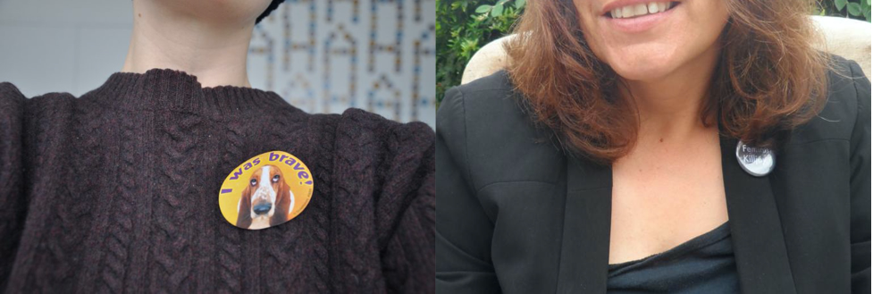 Angela Glanzmann and Sara Ahmed wearing sticker/pin: “I was brave!” and “Feminist Killjoy”