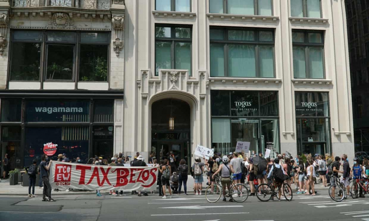 تظاهرات در مقابل آپارتمان شیک ۸۰ میلیون دلاریِ جف بزوس، مدیر عامل آمازون، در نیویورک سیتی برای اعتراض به بدرفتاری این شرکت با کارکناناش در زمان شیوع ویروس کرونا، اوت ۲۰۲۰. عکس: جان مارشال منتل/سیپا/رکس/شاترستاک