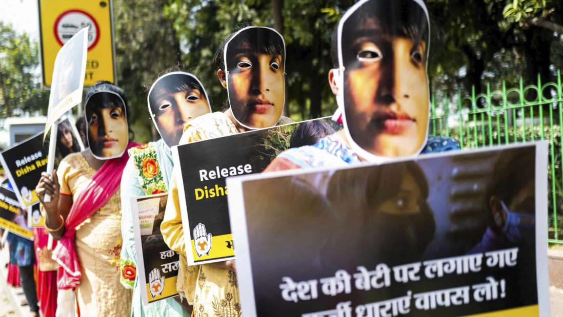 تجمع فعالان «کنگرهی جوانان هند» در حمایت از دیشا راوی در دهلی نو در فوریهی ۲۰۲۱. عکس: جوئِل صمد/ایافپی/گتی