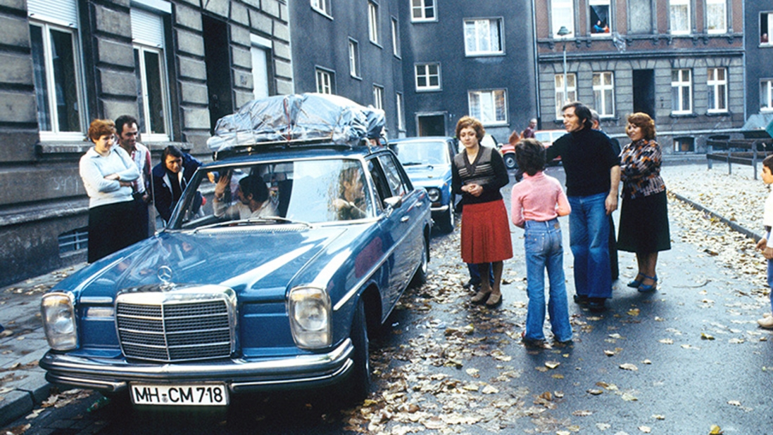بدرقه کردن یک خانوادهی ترک هنگام ترک خانه برای رفتن به تعطیلات سالانهی خود در ترکیه توسط همسایگانشان در اِسِن در آلمان غربی، در سال 1982