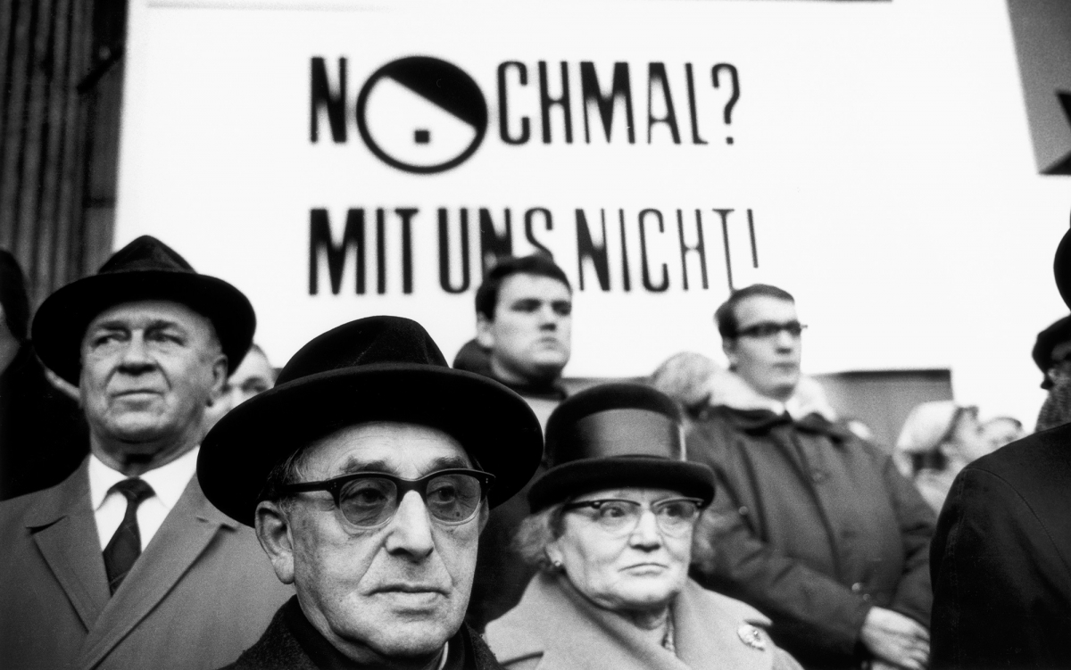 اعتراض شهروندان آلمانی از حزب راست افراطی ناسیونال دموکرات بیرون از کنگرهی 1967 در هانوفر آلمان. نوشتهی روی پوستر: «دوباره؟ نه با ما!»