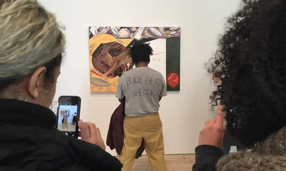 در گالری‌ها تعاملاتی با قطعات هنری نیز روی می‌دهد. دِینا شوتس (Dana Schutz) در تابلوی نقاشی‌اش، تابوت روباز، (2016) که مبتنی است بر چهره‌ی لت و پار شده‌ی اِمِت تیل (Emmett Till)، نوجوانی که در سال 1955 حلق‌آویز شد، به تصرف فرهنگی (cultural appropriation)، و به عبارتی، استفاده از رنج سیاهان به مثابه‌ی «ماده‌ی خام» متهم شد. در واکنش به او، پارکر برایتِ (Parker Bright)، هنرمند، در جلوی تابلو ایستاد در حالی که تی‌شرتی به تن داشت که روی آن نوشته شده بود: «منظره‌ی تماشایی مرگ یک سیاه‌پوست» و درباره‌ی زیان‌های این اثر صحبت کرد: «هیچ‌کس نباید از بدن مرده‌ی یک سیاه‌پوست درآمد کسب کند».