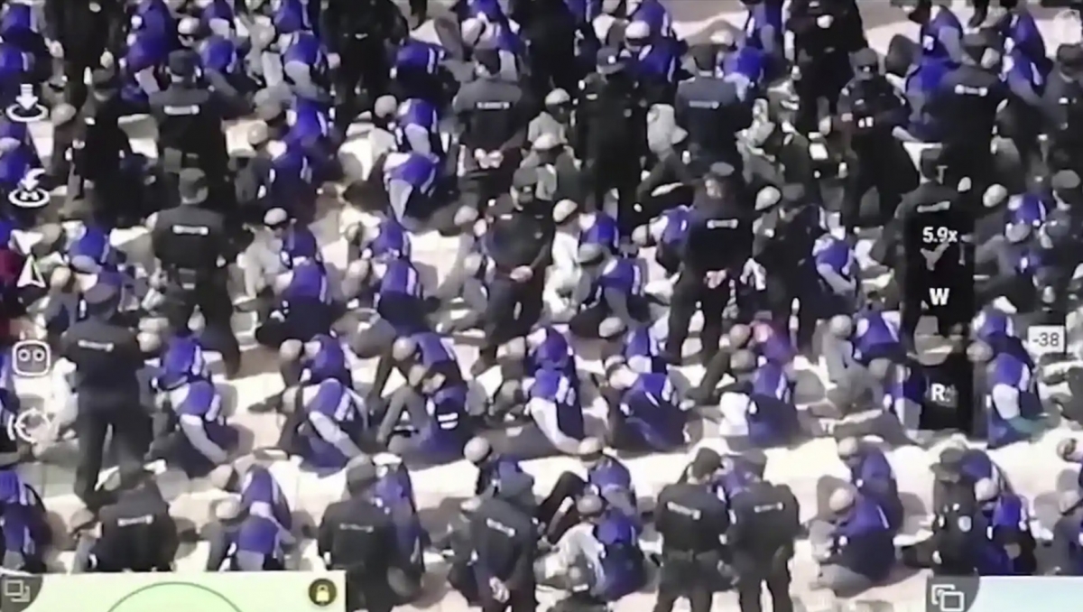 تصویری از یک ویدئو که زندانیانِ سرتراشیده، زنجیرشده و زیر چشمبند را نشان میدهد که احتمالاً اویغور هستند و از یک قطار منتقل میشوند. این عکس احتمالاً در یک ایستگاه قطار در غرب کورلا در جنوبشرقی سینکیانگ در اوت ۲۰۱۸ گرفته شده است