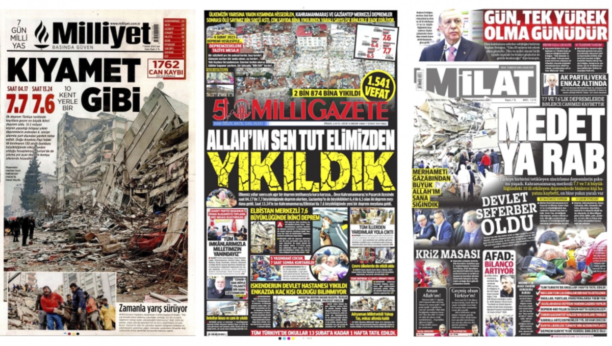 «مددی یا الله»، «فرو ریختیم! خدایا خودت به دادمان برس.»، « قیامت» و «فلاکت قرن» تیتر اول روزنامه‌های نزدیک به اردوغان.
