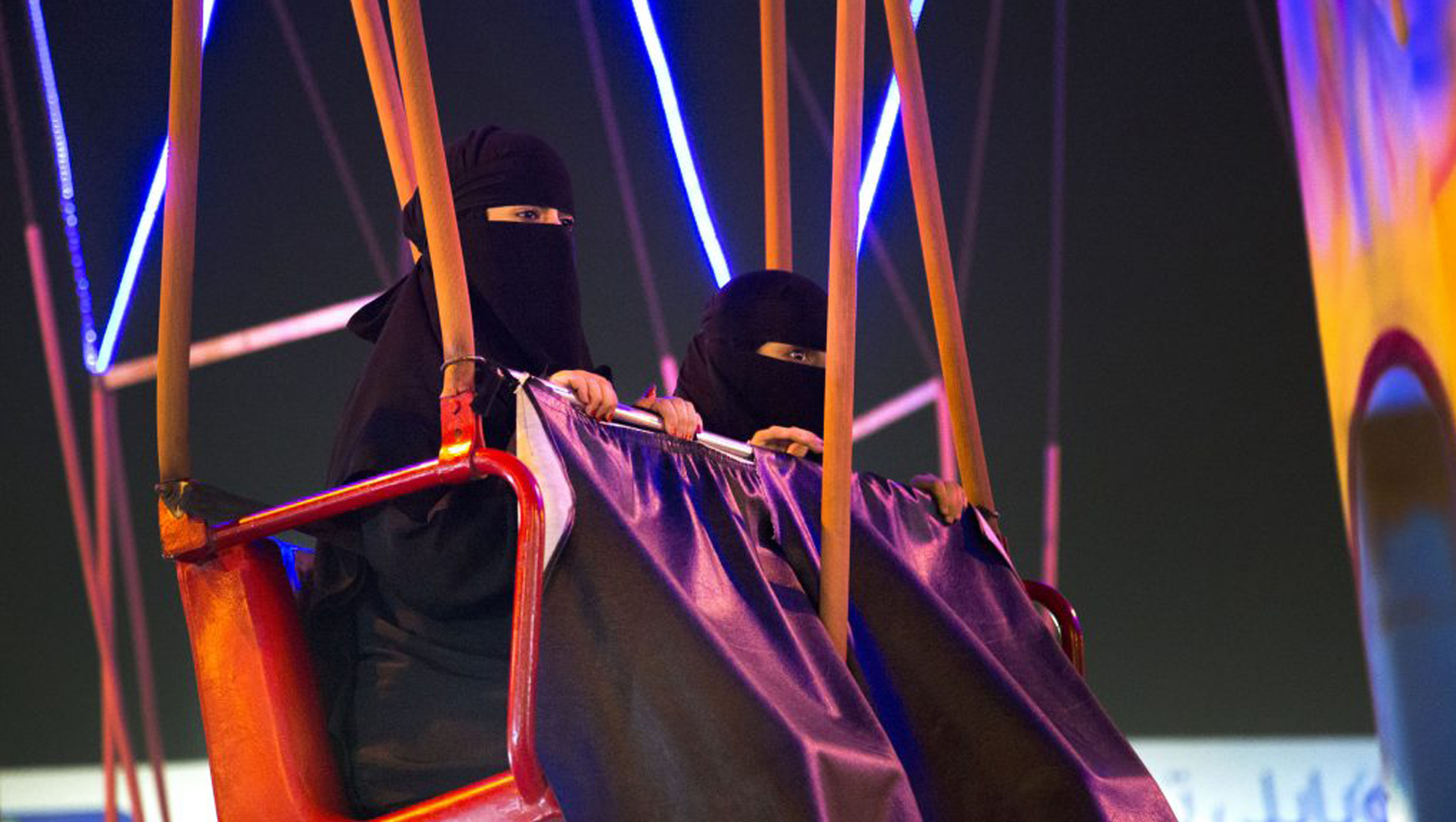 ماشینبرقیها با رنگهای شاد در شهربازی، تابهای چرخان، ترن هوایی و … . اما مسافرانِ این ماشینبرقیها و تابها و ترنهواییها، بچه نیستند. مسافران همگی زنانی سراپا پیچیده در عبا و روسری و روبندهاند و جلوی ماشین برقی و تاب و ترن هوایی پارچهای آویزان یا محفظهای از جنس طلق ضخیم نصب شده تا «عفت» زنان حفظ شود، زنانی که چیزی جز چشمهایشان معلوم نیست.