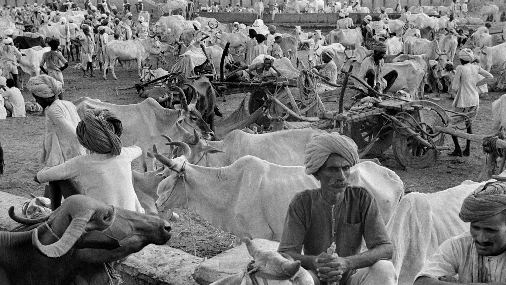 برعکس، عکسهای کارتیه-برسون از هندوستان بیسروصدا، خودخور، و عامدانه ایستا هستند. حتی وقتی در میان جمعیت عکس میگیرد، مثل وقتی که در محل فروش مزایدهایِ دام چنین میکند، علائم کمی از حرکت یا سروصدا وجود دارد. اگر در اروپا او به دنبال «سر بزنگاه» بود، عکسهای پانورامای او از دهقانان و گاوچرانان هندی چیزی آشکارا بیزمان و ابدی در خود دارد. او همچنین از منظری متفاوت استفاده میکند. در اروپا او به شکلی تقریباً نزدیک به بینزاکتی به سوژهی خود رو میکند؛ در هندوستان، او از دور، با نوعی پاستورالیزم یا کلاسیسیسم و با زاویهی باز، عکس میگیرد.