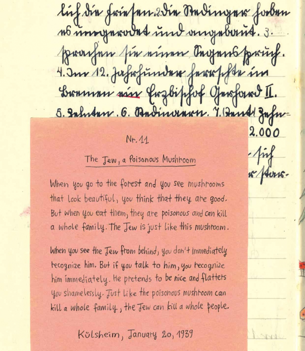 عنوان این مقالهی کوتاه، «یهودی، یک قارچ سمی» است و معلم به املای آن نمرهی c، به دستخط آن نمرهی c و به محتوایش نمرهی b داده است. تاریخ نگارش آن 20 ژانویهی 1939 است، یعنی ده روز پیش از آن که هیتلر اعلام کرد که نتیجهی یک جنگ جهانی دیگر «نابودی نژاد یهودی در اروپا» خواهد بود.