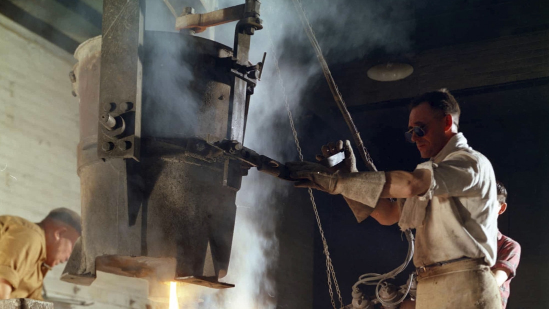 یک کارگر فولادکار در یورکشایر جنوبی در دههی شصت میلادی: «شهر شفیلد در سال ۱۹۷۶، ۴۵,۰۰۰ کارگر فولادکار داشت.» عکس از: هریتج ایمجز/ گتی ایمجز.