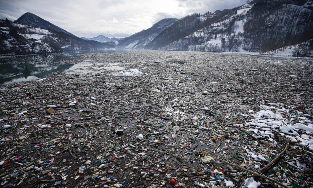 بطری‌های پلاستیکی و زباله‌های دیگر در دریاچه‌ی پوتپِکو در جنوب صربستان در سال ۲۰۲۱ شناورند. AP
