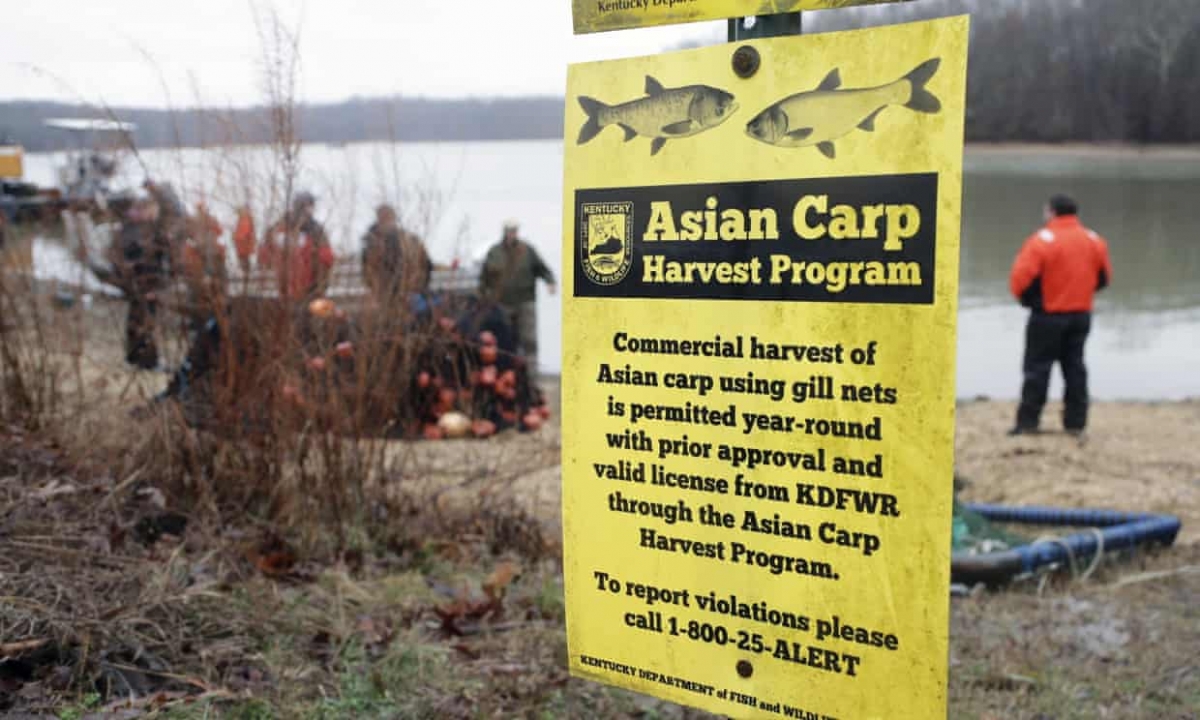 مسئولان حیات‌وحش در برنامه‌ی جمع‌آوری کپورها در دریاچه‌ی کنتاکی در سال ۲۰۲۰ مشارکت می‌کنند. گونه‌های مهاجم ممکن است اکوسیستم آبی رودخانه‌ی میسیسیپی و روهای فرعی را از بین ببرند. عکاس: مارک هامفری/AP