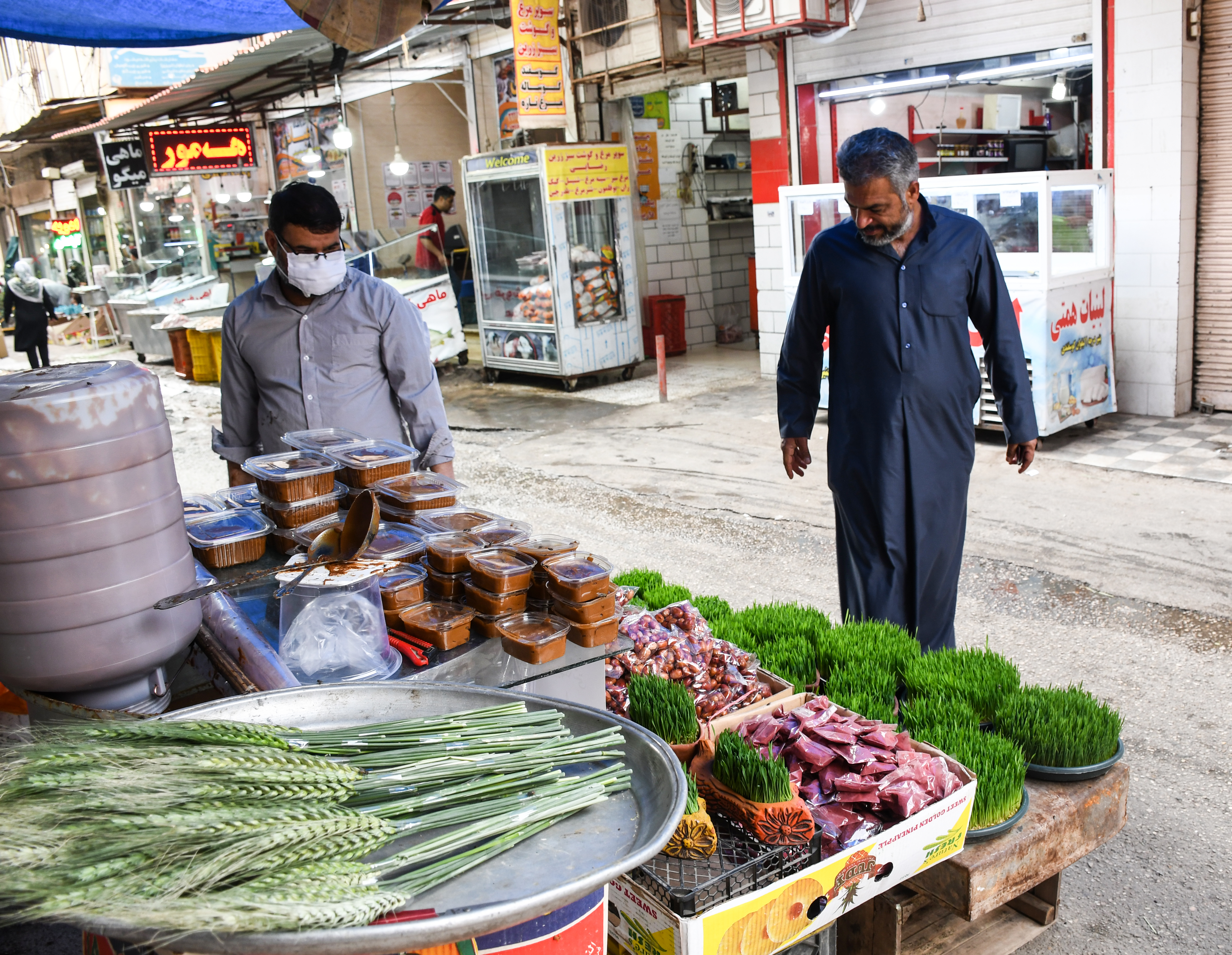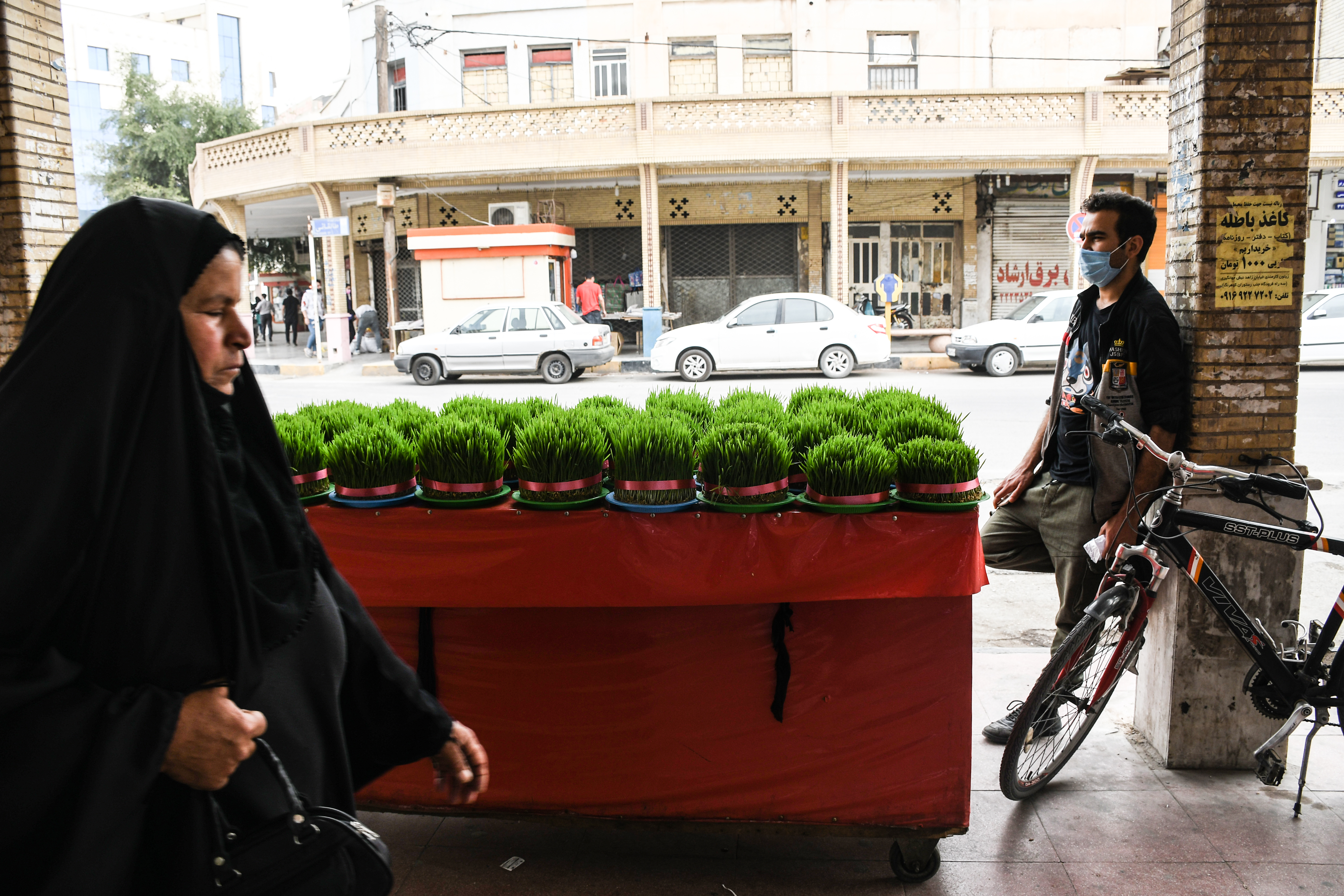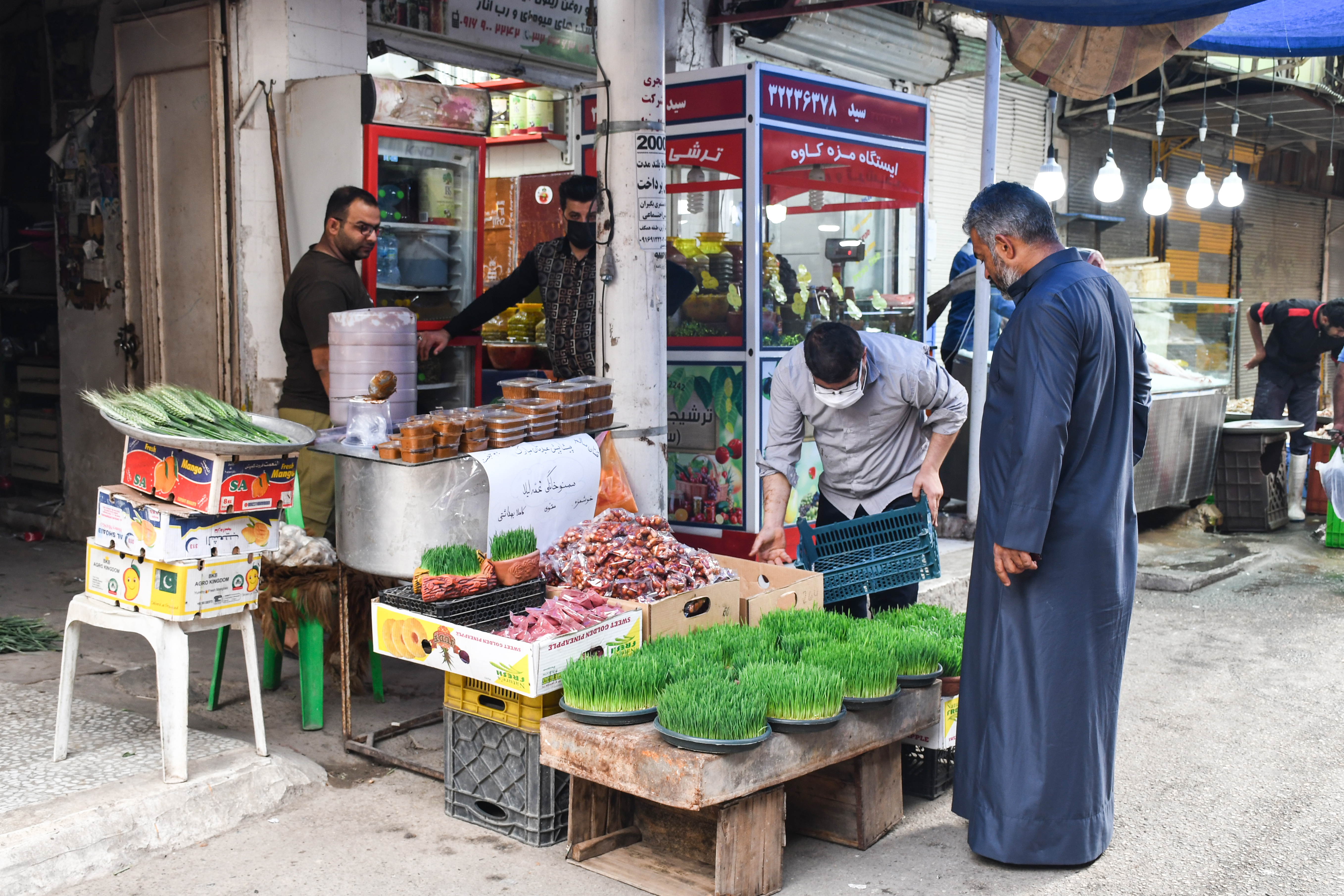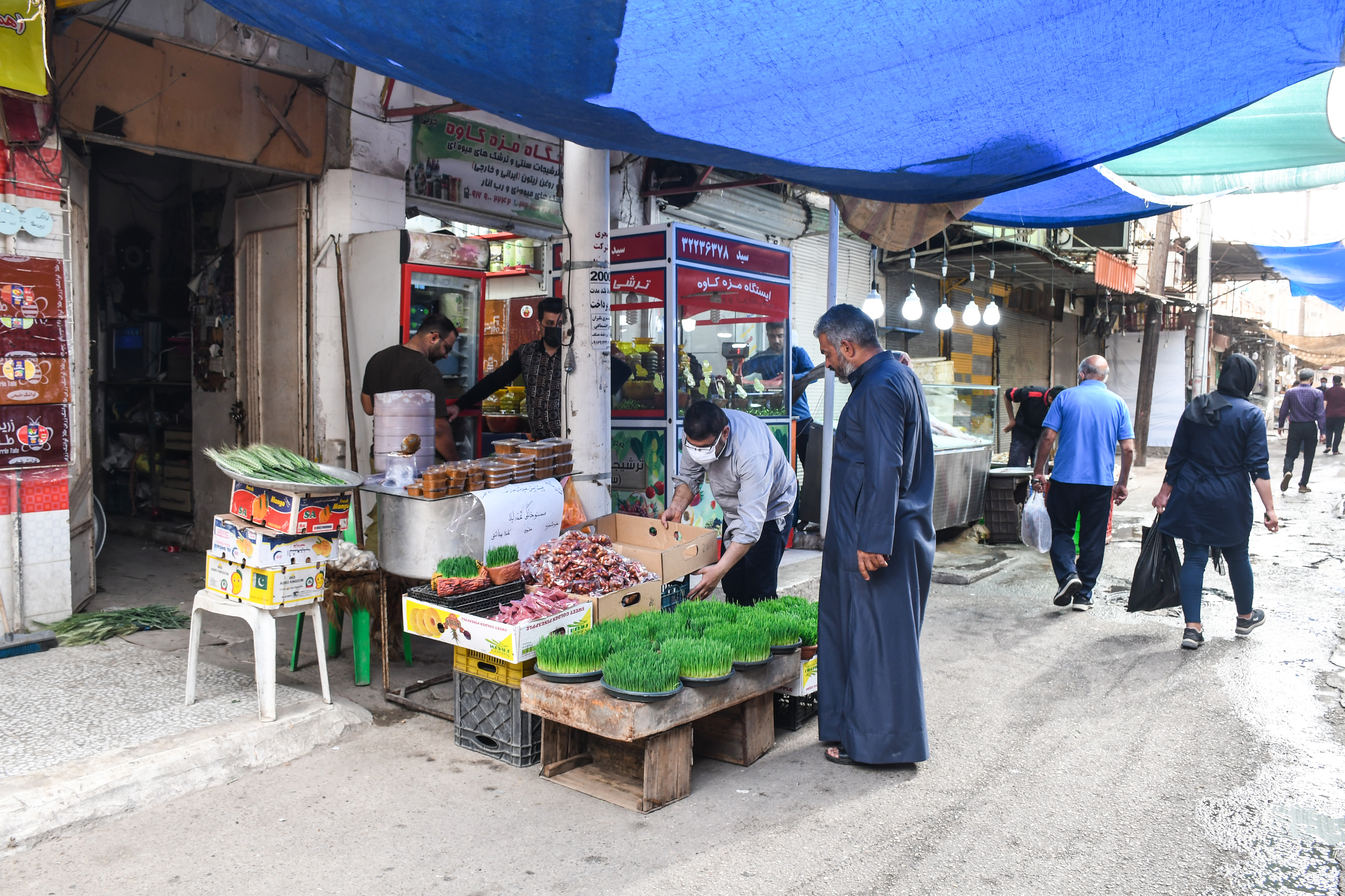 مرکز شهر و محلههای عربنشینِ اهواز. حال و هوای نوروز تحت تأثیر ویروس کرونا مثل هر سال با شور و نشاط همراه نبود با این حال مردم سعی داشتند روحیه ی خود را حفظ کرده و به خرید برای شروع سال جدید بپردازند. (عکس‌ها از شیرین غ)