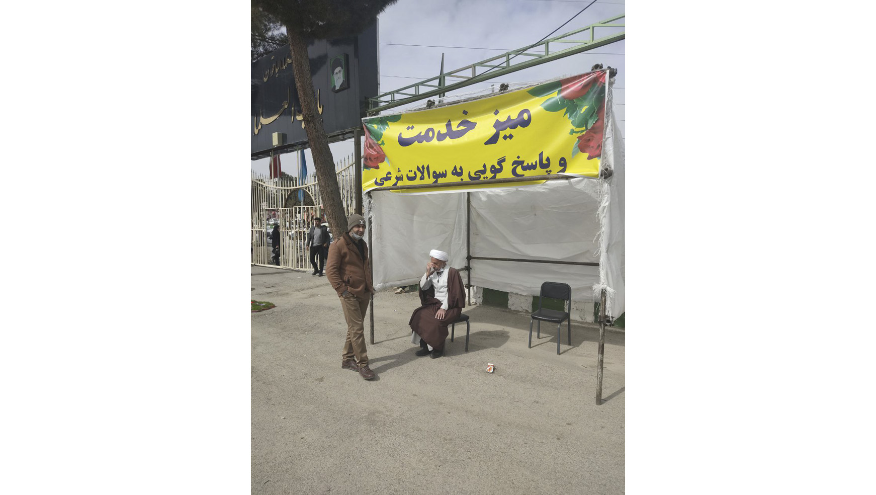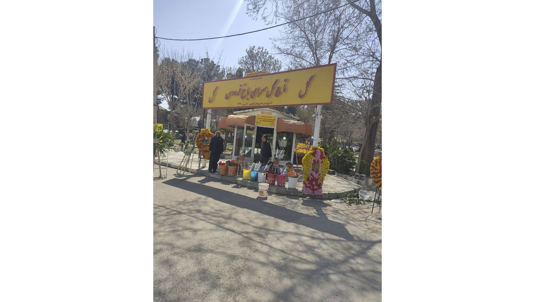 از کنار دکهی گلفروشیِ داخل باغ فردوس که مشتریِ چندانی نداشت، عبور میکنم. به نظر میرسد که خریدهای امروز در همان قسمتِ ورودی انجام میشود و دکهی ثابت باغ فردوس مشتری چندانی در شلوغترین روز سال ندارد. بهسمت ورودیِ دیگر ــ «باب العلما» ــ حرکت میکنم. کنار ورودی با داربست فلزی و چند تکه گونی پلاستیکیِ سفیدرنگ، یک اتاق کوچک درست کردهاند. یک بَنِر بر سردرش زده شده که نوشته: «میز خدمت و پاسخگویی به سؤالات شرعی.» داخل اتاقک یک روحانی نشسته است. کمی صبر کردم اما کسی به میز خدمت مراجعه نکرد. تصمیم گرفتم که برگردم و بین قبرها قدم بزنم.