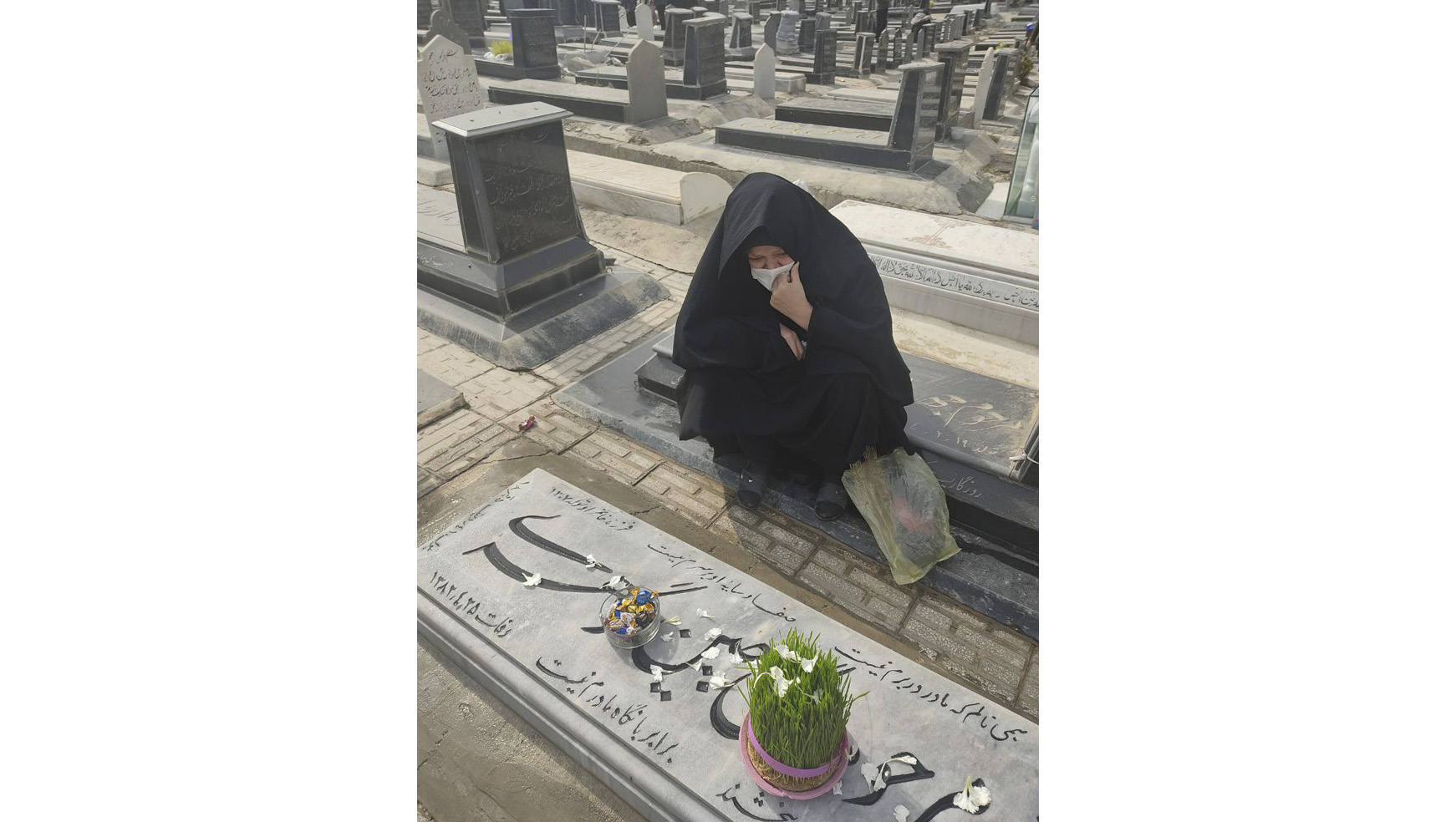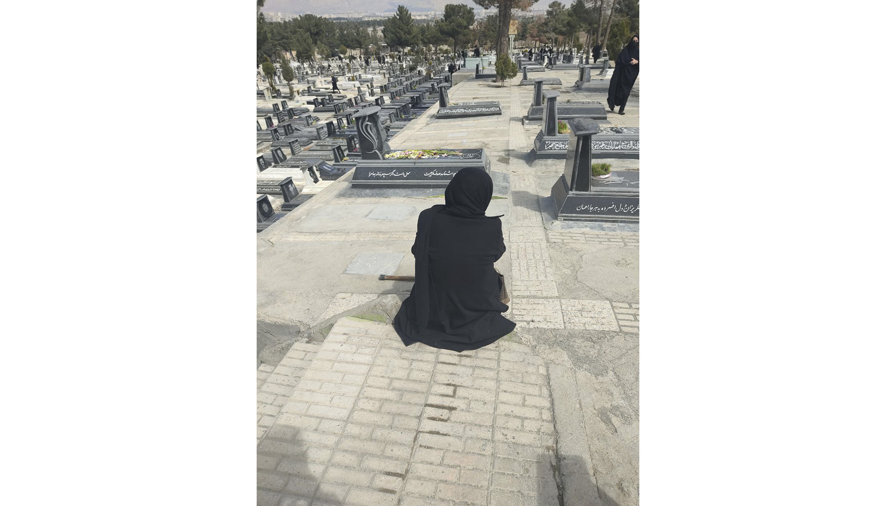 بین قبرهایی که به چشم میآید، تعداد کسانی که تنهایی پای سنگ مزار نشستهاند، کم نیستند. اکثرشان زن هستند. مردهای زیادی تکوتنها دیده نمیشوند. چند تایی در کنار قبرهایی نشستهاند که تاریخ فوتِ نوشته بر روی قبر، مربوط به یک سال اخیر است. جایی بین قبرهای قدیمی، زنی با قلم و جوهر سیاه، آرام و با حوصله مشغول پررنگکردن نوشتههای روی یک سنگ قبرِ رنگورورفته بود. زنی دیگر فرش قرمز کوچک و تمیزی پهن کرده بود و در تنهایی و سکوت با میوه، شیرینی، شمع و گل کنار قبری نشسته بود. بالاتر از او، زنی کنار قبری با سنگ قدیمی، چادرش را روی صورتش کشیده بود و با صدایی نامفهوم شعر میخواند و آهسته گریه میکرد.