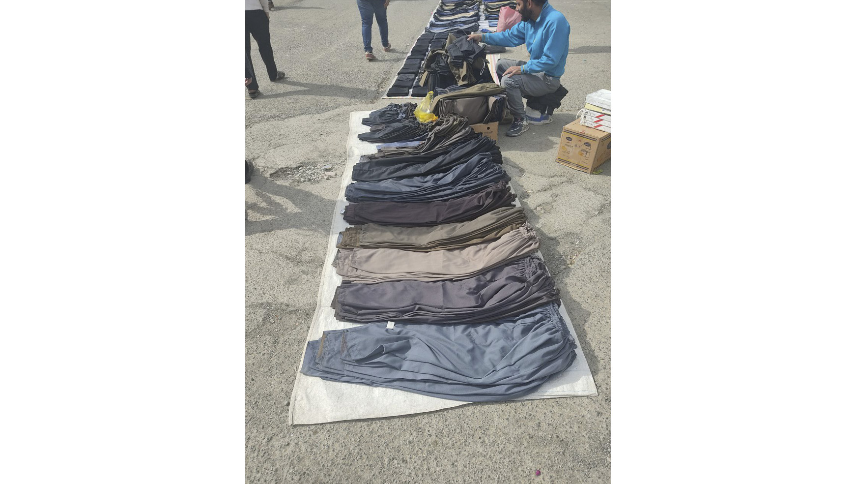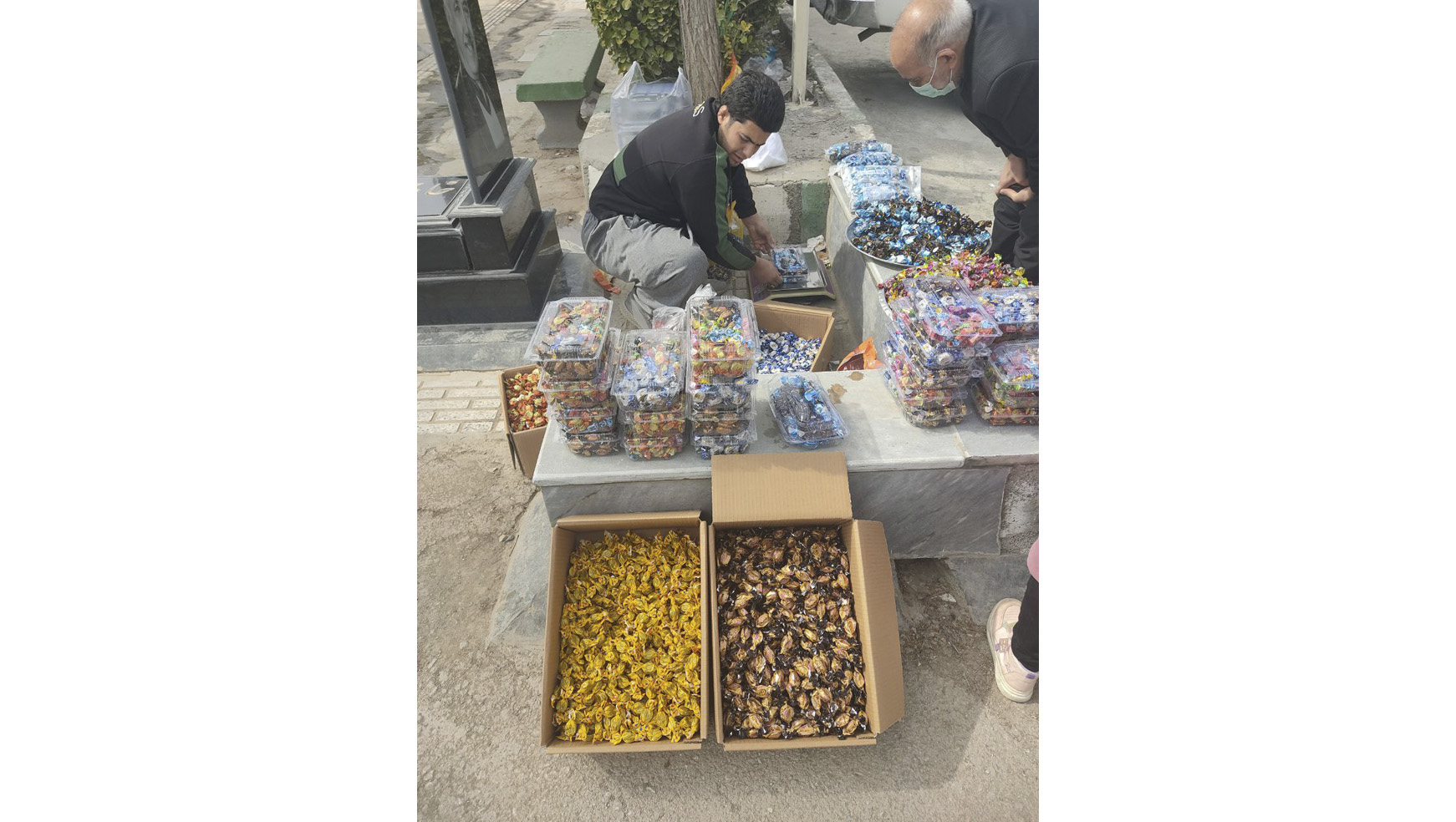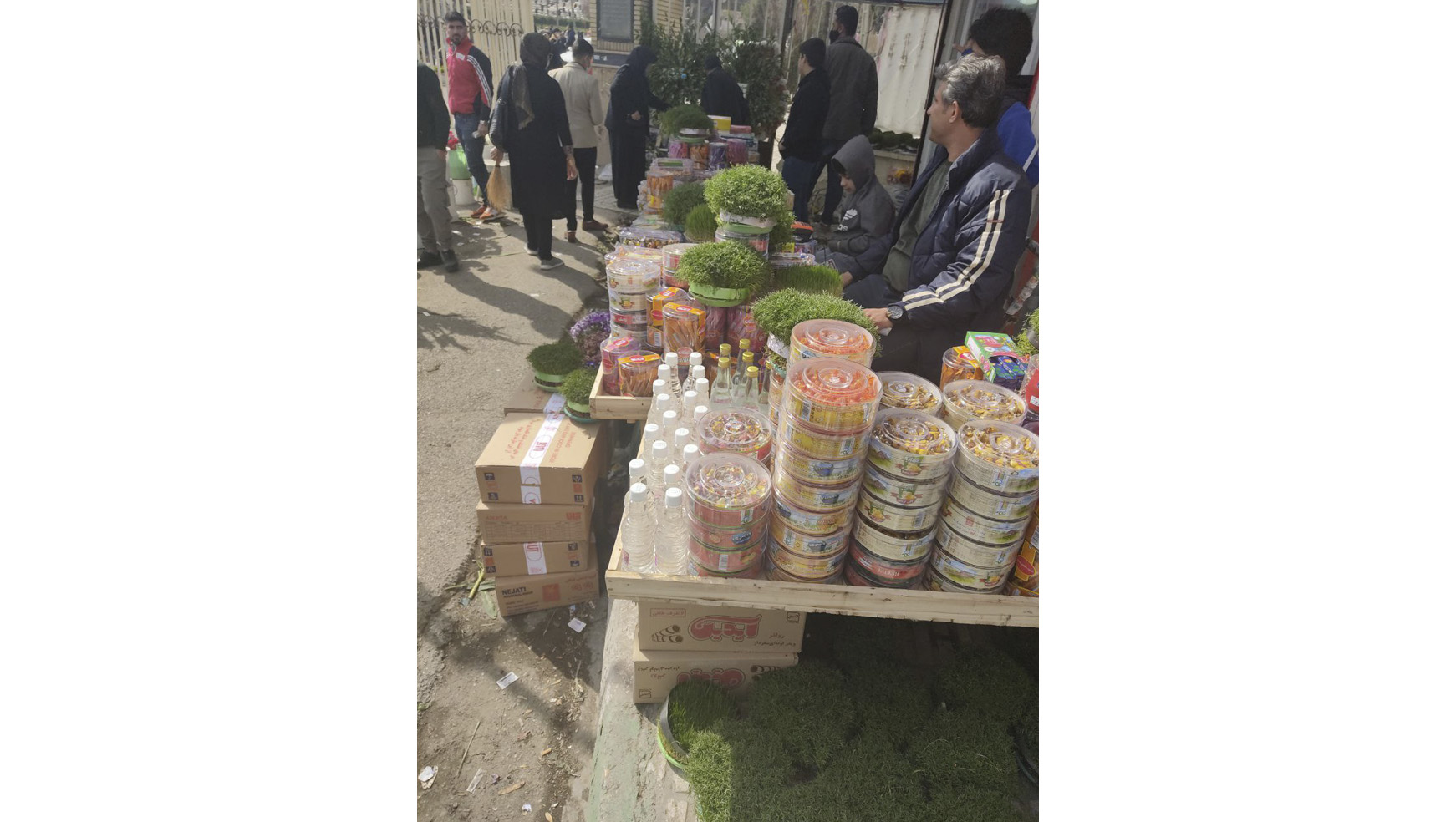 وارد محوطه میشوم. بین اجناسی که روی زمین چیده شده، شیرینیِ مخصوص کرمانشاه همهجا هست: «کاک» و «نان برنجی»، بستهای بیستهزار تومان. بِرَندهای ناشناخته و بستهبندیهایی که چندان مرغوب نیست احتمالاً دلیلی بزرگ برای این قیمت پایین باشد. برندهای اصلی در بازار تقریباً با دو برابرِ این قیمت به فروش میرسد. بقیهی اجناس، یا گرانتر از مغازههای داخل شهر است یا تفاوت چندانی ندارد؛ شلوار کردی، گلاب، شمع و گندم. شکلات اما بیشترین فروشندهها را دارد. هر بساط یک جنس. فروشندهها از هر سنی هستند اما در میانشان بهندرت میتوان زنی یافت. در مسیرهای خلوتتر شاید مشتریها کمتر باشند اما فضای بیشتری وجود دارد تا فروشندهها، سبزه و گل و شیرینی را طوری بچینند که حسابی به چشم بیاید. در قسمت پارکینگ که امروز خالی است و خودروها اجازهی ورود ندارند، در نقطهای با فاصلهی کمی بیشتر از بقیه، زن و مردی همراه با سه کودک نشسته بودند و سبزه، شیرینی و گلاب میفروختند. گرچه در آن چند دقیقه چندان اثربخش نبود اما کودکِ کوچکتر با فریادهای پیاپی سعی در جلب مشتری داشت.