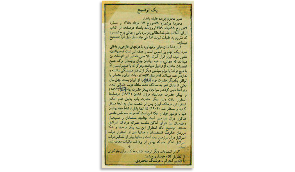 تنها پاسخ جامعه بهائیِ ایران که اجازۀ نشر یافت. روزنامۀ بامداد امروز مرداد 1358