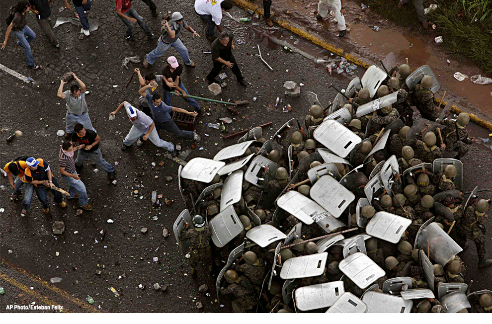 برخورد حامیان رئیس جمهور هندوراس مانوئل زلایا با سربازان در نزدیکی اقامت ریاست جمهوری تگوسیگالپا، دوشنبه ۲۹ ژوئن ۲۰۰۹.