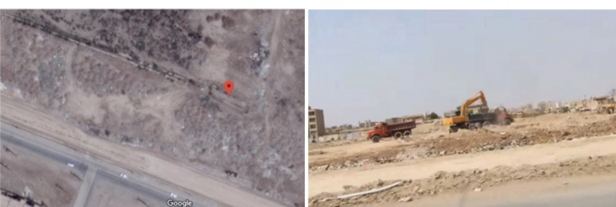 عکس سمت راست: بولدوزرها و کامیونها در محوطهی گور جمعی اهواز مشغول کارند، 20 ژوئیهی 2018، عکس: «عدالت برای ایران»