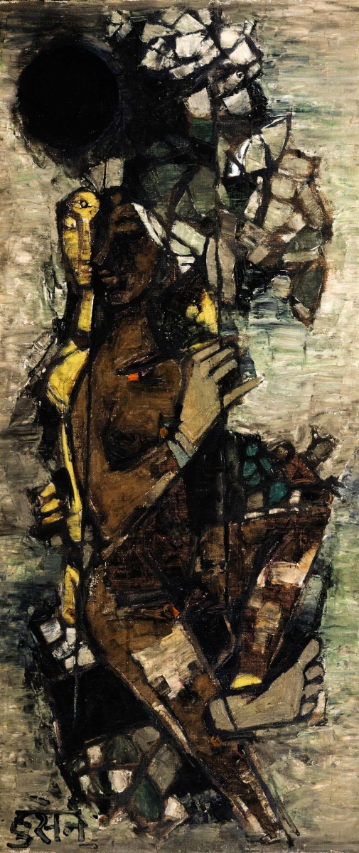 البته داستان واقعی پشت این ماجرا، پیش‌پا‌افتاده‌تر و سرراست‌تر از این‌هاست. پیشگامان به دقت اما به دور از پایبندی به سنت، به آثار هنری قدیمی هندی توجه می‌کردند و هر چه را می‌پسندیدند، انتخاب و در خدمت اهداف خود به روز می‌کردند. دو نقاشی موجود در این بخش به خوبی وسعت  رویکرد‌های آنان را نشان می‌دهند. عاشقان (۱۹۵۲) اثر اکبر پادامسی تصویری آرام و جذاب از یک زوج  برهنه بر  گاو نشسته‌ را نشان می‌دهد. گاو به طور سنتی با خدای شیوا در ارتباط است؛ فهم این نکته سخت نیست که چرا برگزار‌کنندگان نمایشگاه، این نقاشی را در کنار مجسمه‌ای از شیوا و پراواتی متعلق به قرن دهم قرار داده‌اند. اما پادامسی نمی‌خواسته چنین ارتباطی را ترسیم کند، دست‌کم نه اینقدر ظاهرگرایانه. اما ترکیب عجیب نمایشِ قویِ هوس (انحنای اعضای بدن، پیکرهای ظریف)‌ و معصومیت (چهره‌ی بی‌اعتنا، فقدان محض تنش) است که این تصاویر را با مجسمه‌های قدیمیِ خدایان هندی متجانس می‌سازد.