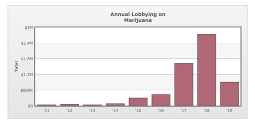 از سوی دیگر، آزادسازی مواد غیرقانونی و توسعهی این بازار و روشهای جدید بازاریابیِ این کالا، به این تصور دامن میزند که استعمال ماریجوانا نه تنها مشکلی ایجاد نمیکند بلکه مفید هم هست. افزایش تقاضا برای استفادهی تفریحی ماریجوانا به تولید فراوردههای جدیدی از این کالا (مثل آبنباتهای نرم، شکلات و کیک) دامن زده که در آن مادهی مضرّ THC (tetrahydrocannabinol) تقریباً ده برابر این ماده در چند دههی گذشته است. و تولید این کالاها با سرعتی سرسامآور در حال رشد است. نمودار زیر رشد هزینهی گروههای فشار این بازار را نشان میدهد که در سال 2018 بیش از ۲.۷ میلیون دلار بوده است: