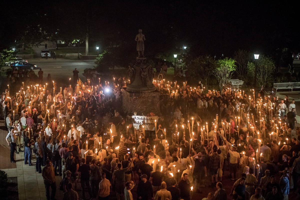 در اوت ۲۰۱۷، ملی‌گرایان سفیدپوست در برابر مجسمه‌ی توماس جفرسون در دانشگاه ویرجینیا در شارلوتسویل تجمع کردند. دانشجویان معترضی که مخالف این تجمع بودند به همراه پرچمی در زیر مجسمه ایستادند. اِدو بیر/ نیویورک تایمز