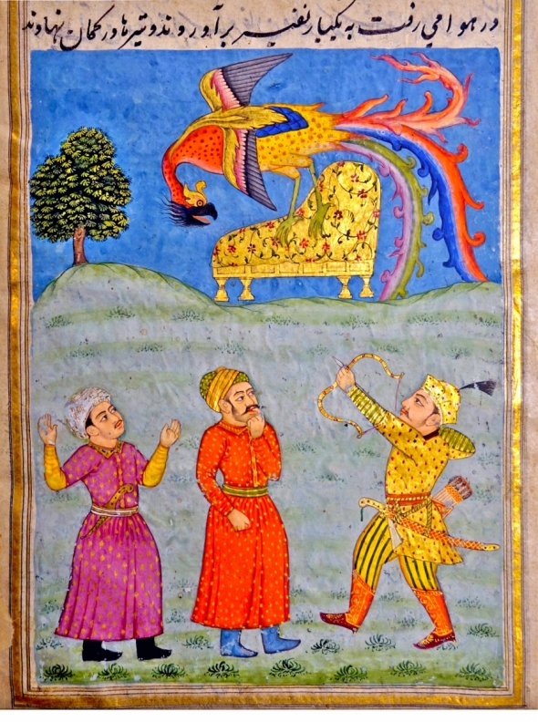 مردانِ شاه مغرب به سوی سمیرغ، که دارد گهوارهی شاهزاده را میدزدد، تیر میاندازند. به تفاوت منزلت اشخاص توجه کنید که در لباسهایشان منعکس شده است. قصهی قضا و قدر. کتابخانهی بریتانیا.